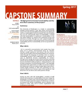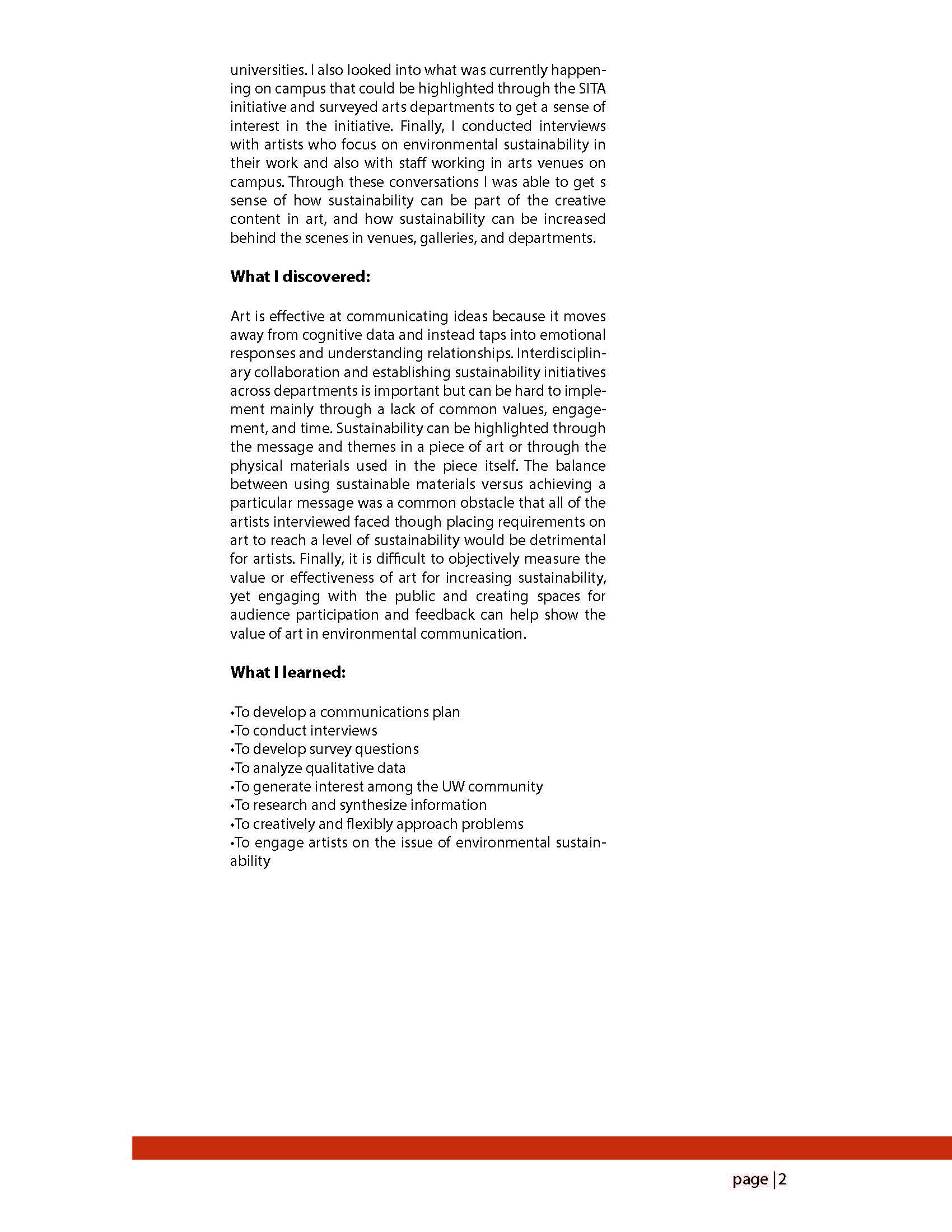 The University of Washington is a leader in sustainability funding several projects a year that reduce environmental impact. One side of sustainability that had yet to be addressed was how sustainability can be increased in the arts, including how art can communicate ideas of sustainability. I worked with UW Sustainability to implement a Sustainability in the Arts (SITA) initiative on campus and conducted surveys and interviews of artists. Through my work I gained insight into how art can be used to communicate issues of environmental sustainability and how sustainability can be incorporated into artworks.