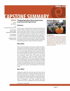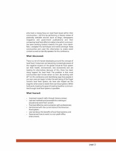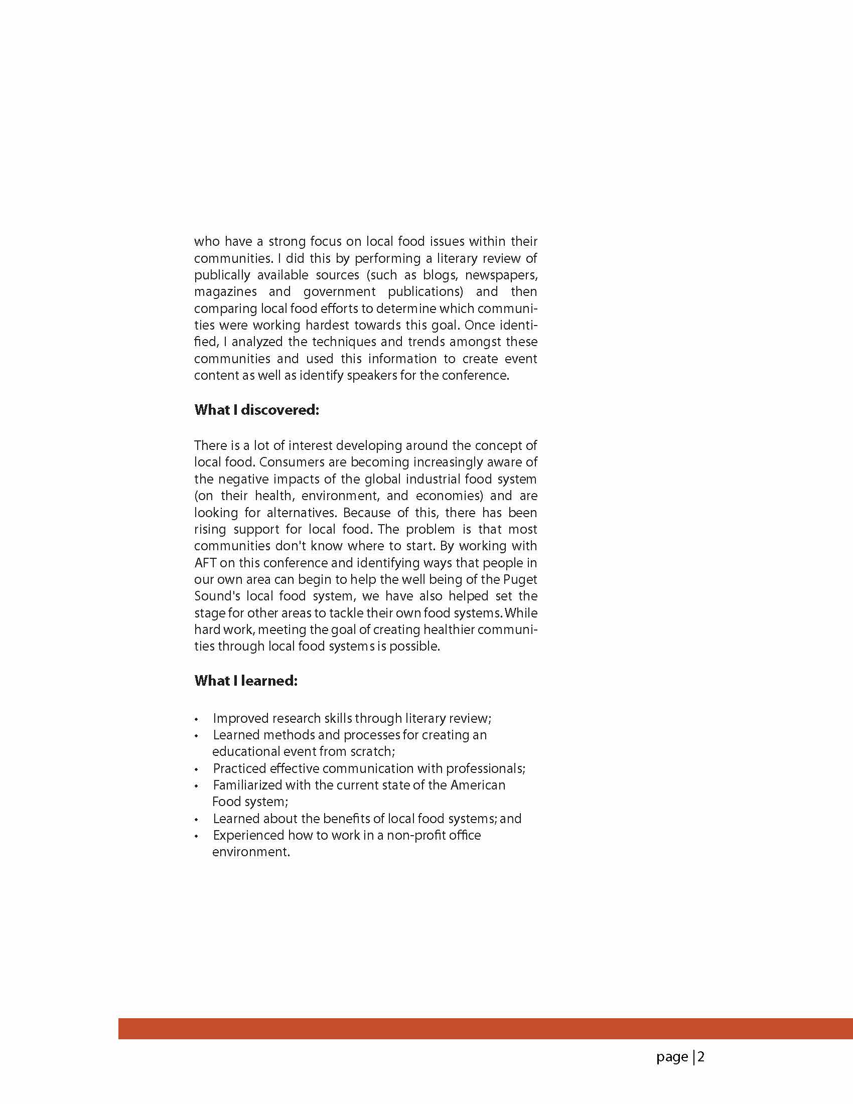 For my project, I worked with the American Farmland Trust (AFT) to create a conference for professionals in the Puget Sound area that would provide tools and information about using their positions to help protect farmland and encourage both local food production and consumption. As a part of the preliminary research for the conference, I looked for communities in the United States with progres- sive local food systems. By doing this, I was able to analyze the status of the current food system and then implement these findings into the content of the AFT conference.