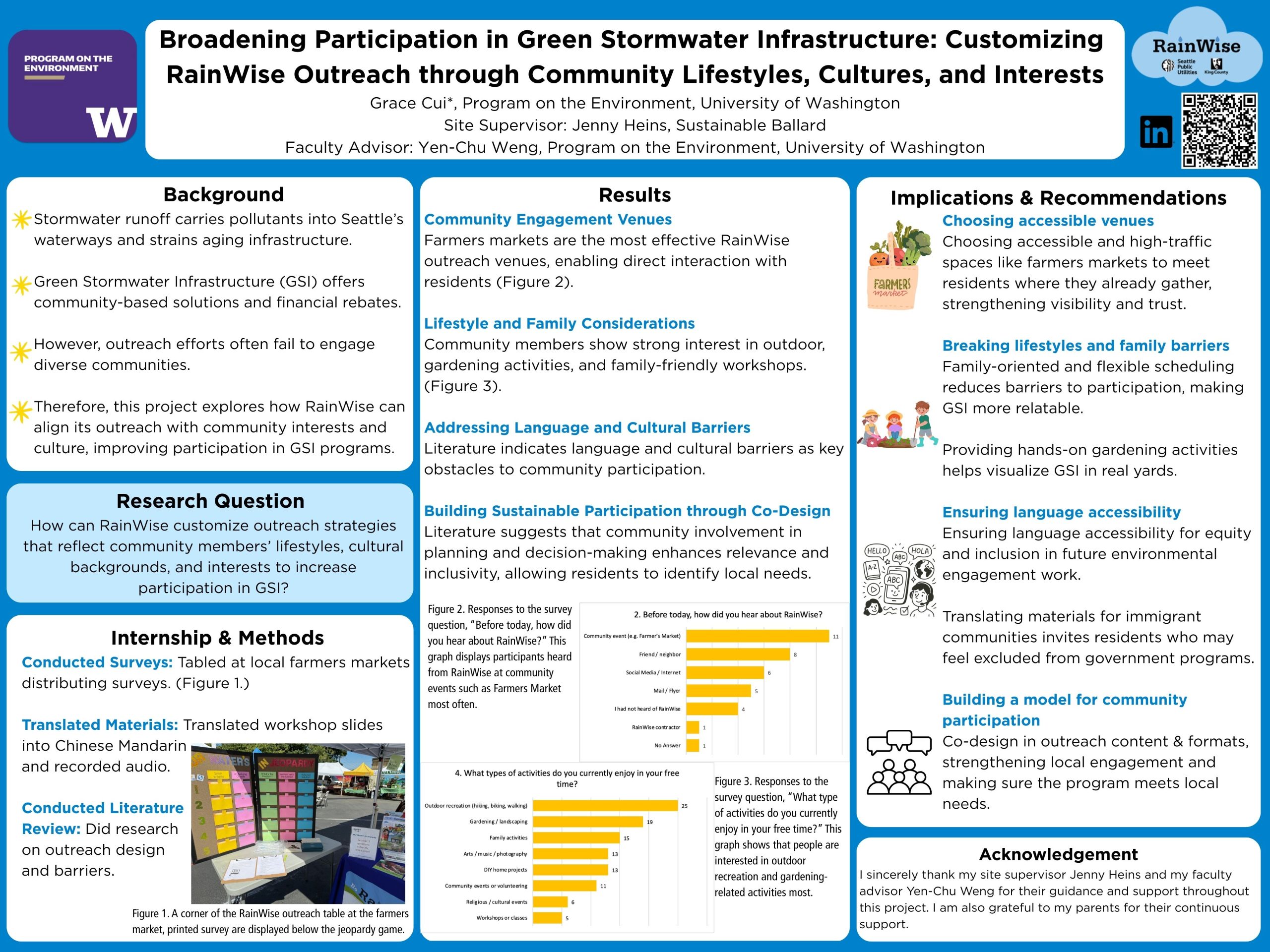 Stormwater runoff pollution is a major environmental and public health issue in Seattle, accounting for approximately 30% of local water contamination. Pollutants such as oil, fertilizers, bacteria, and heavy metals flow from urban surfaces into waterways, threatening ecosystems and human health. The RainWise rebate program promotes the installation of green stormwater infrastructure (GSI) such as rain gardens and cisterns to mitigate the stormwater runoff impacts. However, the adoption of GSI remains limited, so there is a need for more effective community outreach. This study examines how RainWise can customize its outreach strategies to reflect community members’ lifestyles, culture, and interests to broaden participation in the GSI programs. The method includes attending tabling events at neighborhood farmers markets and summer festivals, collecting surveys, translating workshop materials into Chinese Mandarin, and conducting the literature review. Findings reveal that residents are most interested in outdoor, family-friendly, and gardening workshops, and that outreach through farmers markets is highly effective. Language barriers remain a challenge, but providing materials in multiple languages can significantly increase participation. This research also found that community participation in decision-making could make the community engagement work more effective and sustainable. Overall, aligning RainWise outreach with community lifestyle, culture, and interests can promote more inclusive engagement and strengthen adoption of green stormwater infrastructure.