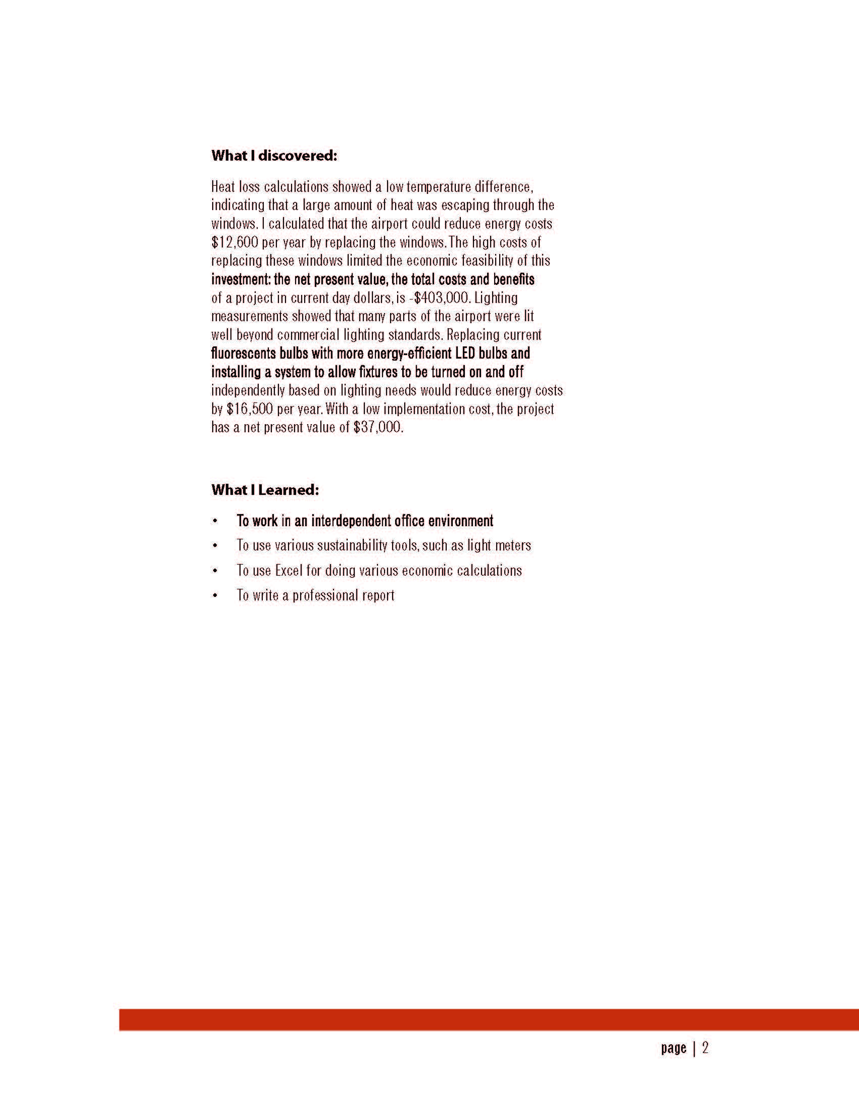 As an intern for the Port of Seattle, I looked at the energy-efficiency of South Satellite Building on the Sea-Tac Airport. I focused on improvements to windows and lighting and wrote a report on two projects the airport could undertake. I found that lighting improvements are economically beneficial, while windows are not yet feasible.