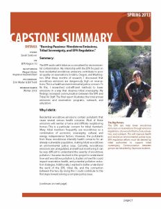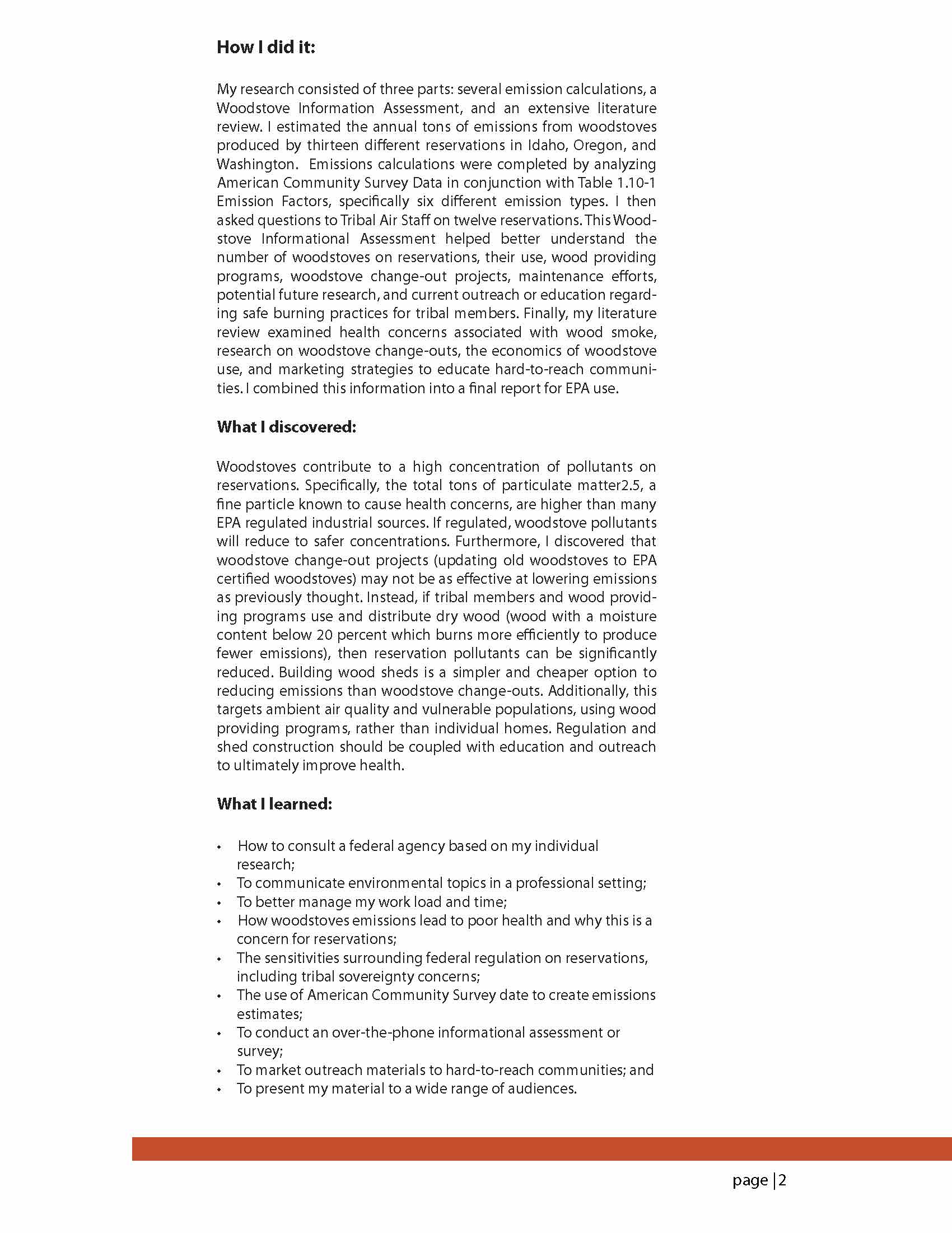 The EPA works with tribes as a consultant for environmental contamination. My internship with the EPA focused on how residential woodstove emissions contribute to poor air quality on reservations in Idaho, Oregon, and Washing- ton. After three months of research, I discovered that woodstove emissions are dangerously high on reservations. This is a health and environmental justice concern. To fix this, I researched cost-efficient methods to lower emissions in a way that observes tribal sovereignty. My findings increased communication between the EPA and Tribal Air Staff. The final report illustrates the total annual emissions and reservation: programs, outreach, and education.