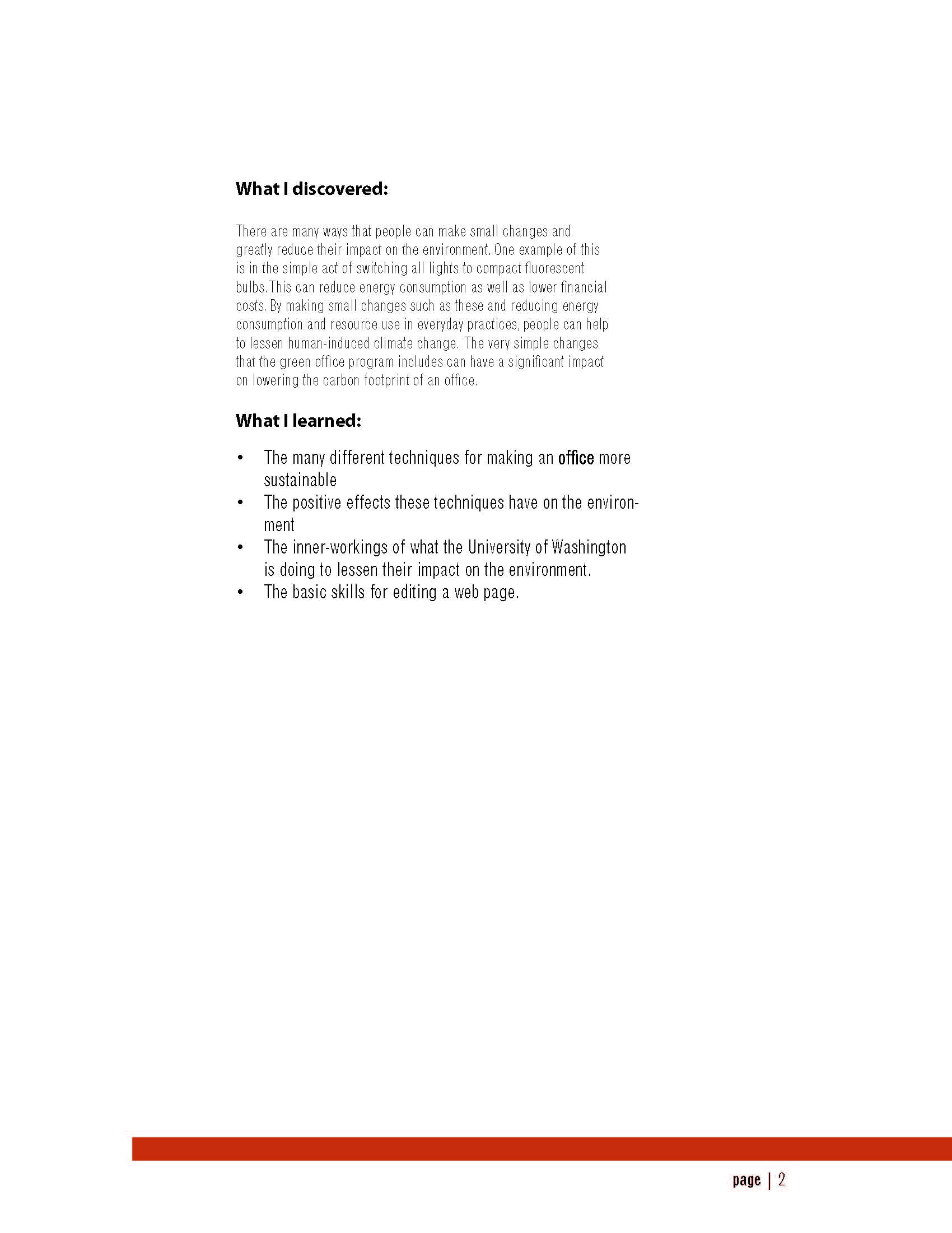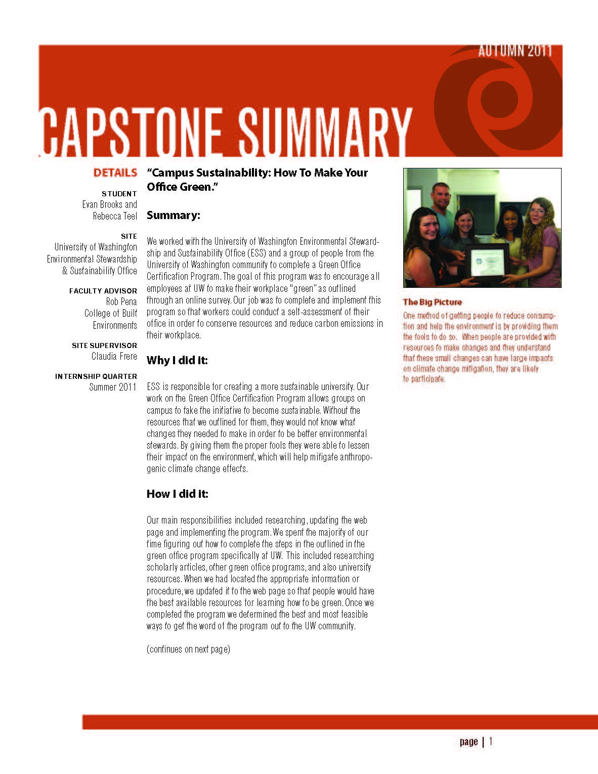 We worked with the University of Washington Environmental Stewardship and Sustainability Office (ESS) and a group of people from the University of Washington community to complete a Green Office Certification Program. The goal of this program was to encourage all employees at UW to make their workplace“green” as outlined through an online survey. Our job was to complete and implement this program so that workers could conduct a self-assessment of their office in order to conserve resources and reduce carbon emissions in their workplace.