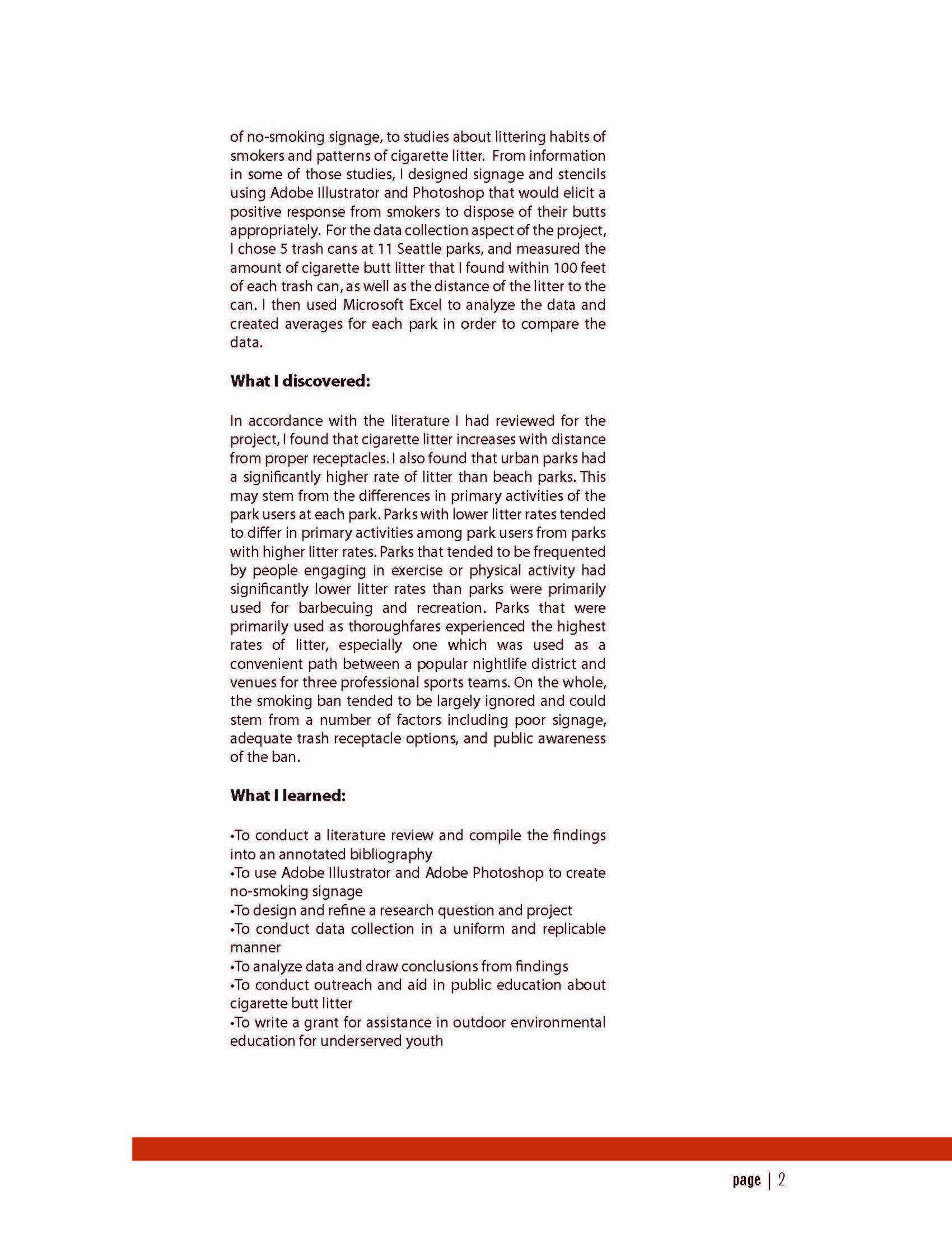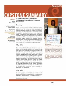 For my Capstone, I worked with the Surfrider Foundation and their “Hold On To Your Butt” (HOTYB) campaign to study the deposition pattern of cigarette litter in Seattle parks and how it corresponds to placement of trash receptacles. I conducted a literature review of previous studies to help provide some background for my research, and to help with the design of my project. I also conducted outreach at Surfrider events and at local businesses to try and garner support for the HOTYB campaign, as well as designing some no-smoking signage and stencils for parks and beaches, respectively. My research found that litter rates increase with the distance to proper receptacles.