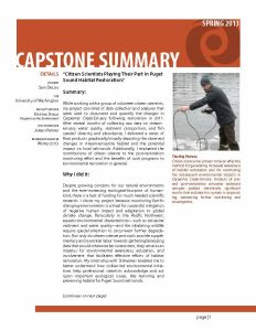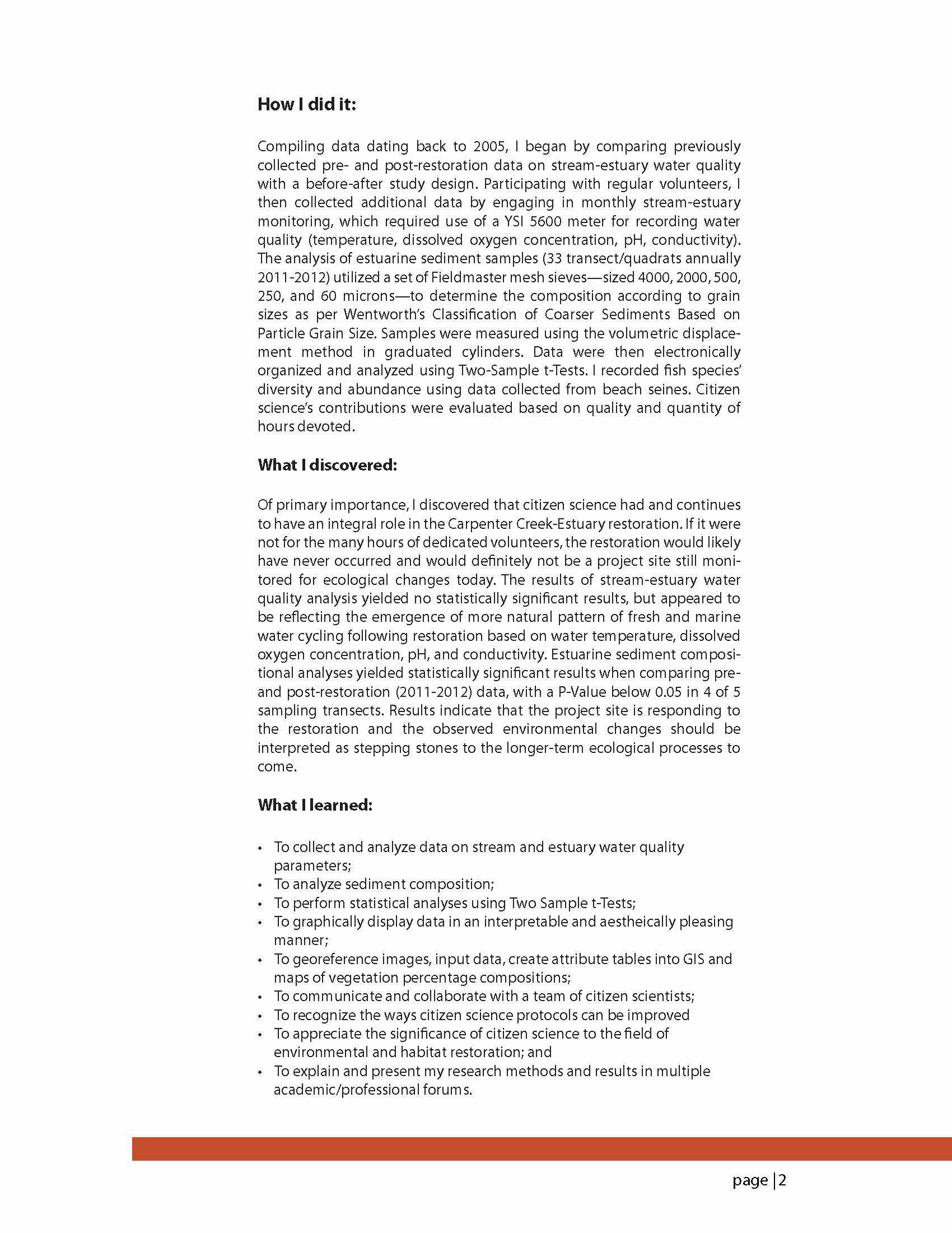 While working with a group of volunteer citizen scientists, my project consisted of data collection and analyses that were used to document and quantify the changes in Carpenter Creek-Estuary following restoration in 2011. After several months of collecting raw data on stream- estuary water quality, sediment composition, and fish species’ diversity and abundance, I delivered a series of final products graphically/visually depicting the observed changes in stream-estuarine habitat and the potential impact on local salmonids. Additionally, I evaluated the contributions of citizen science to the post-restoration monitoring effort and the benefits of such programs to environmental restoration in general.