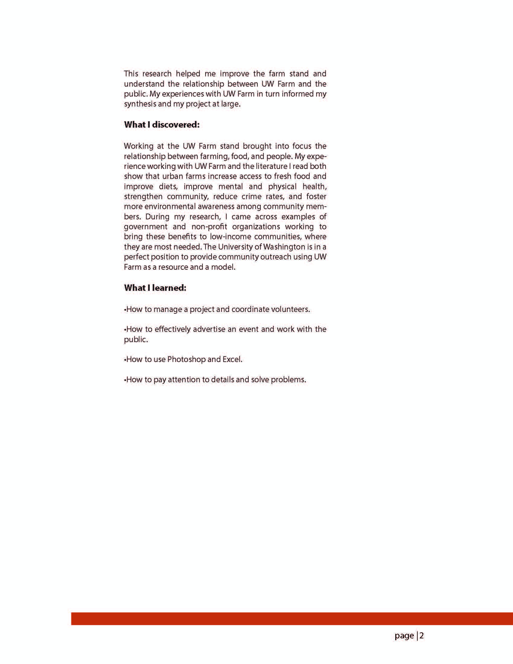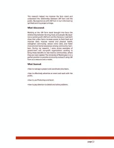 For my capstone project, I worked with UW Farm to open an off-campus farm stand which I continued to manage throughout the summer. I was interested in the benefits of urban farms, how these benefits related to social privilege, and how urban farms can help to create a more sustain- able and equitable food system. During my internship I noticed the positive effects that UW Farm seemed to have on volunteers, interns, and farm stand customers, and this led me to consider ways in which urban farms could be used to benefit low-income communities.