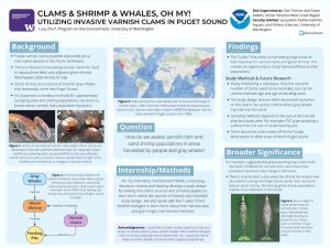 Invasive species can adversely impact native ecosystems once their populations are established, but sometimes these non-native species have the potential to be used for our benefit. Varnish clams (Nuttallia obscurata) are a non-native species in Puget Sound. The Tulalip Tribe has recently shown interest in harvesting varnish clams to use as aquaculture feed and for commercial use. Ghost shrimp (Neotrypaea californiensis) are found adjacent to varnish clams and are an important source of prey for gray whales (Eschrichtius robustus) that feed on them by sifting through the sand, which leaves behind large feeding pits. The relationship to varnish clams is that there’s evidence of varnish clam recruitment within the feeding pits left behind by the gray whales. The aim of my internship was to learn about varnish clams and create a study design that can be used to monitor varnish clam and ghost shrimp populations in Northern Puget Sound after harvest. I performed literature reviews to learn about the species of interest and the physical environment of the nearshore. In addition, we spoke with the Tulalip Tribe’s shellfish biologist to gather relevant information regarding harvest plans. Learning more about species’ populations is important because it can help us make management decisions, determine if sustainable harvest is possible, and inform us about species interactions. As physical environmental conditions change, it will be increasingly important to study species populations because of the impacts they could have on one another.