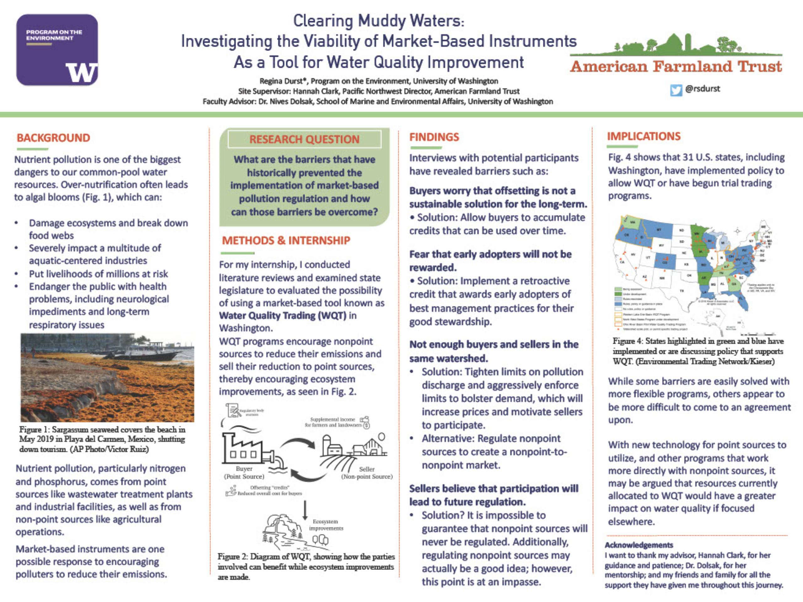 Water Quality Trading (WQT) programs are market-based instruments that have the potential to greatly improve the health of many of our common-pool water resources. Although nutrient pollution negatively affects the environment, public health, and a multitude of aquatic industries, many of the nonpoint sources that discharge nutrient pollution remain unregulated in the United States. By encouraging WQT programs, where regulated point sources (PS) pay unregulated nonpoint sources (NPS) to offset their pollution, it may be possible to reduce the total environmental impact on our waters. The purpose of this study was to discover if a market-based trading program would be viable in Washington. To accomplish this task, I examined state legislature to see whether a program could be supported without further changes to local policy. I also conducted a literature review of case studies to understand the barriers that trading programs have historically faced and compared the proposed model with past successful markets. Findings show that, while Washington policies allow trading programs, it is unlikely that many trades would occur due to a number of concerns on both supply (NPS) and demand (PS) sides. Concerns were primarily focused on high transaction costs, reluctance to trade with unfamiliar parties, and the perception of some farmers that participating would lead to future regulation or greater public scrutiny. I concluded that, in its current iteration, WQT is unlikely to find great success in Washington State, and that it may be fruitful to pursue programs that work more directly with farmers and landowners instead.