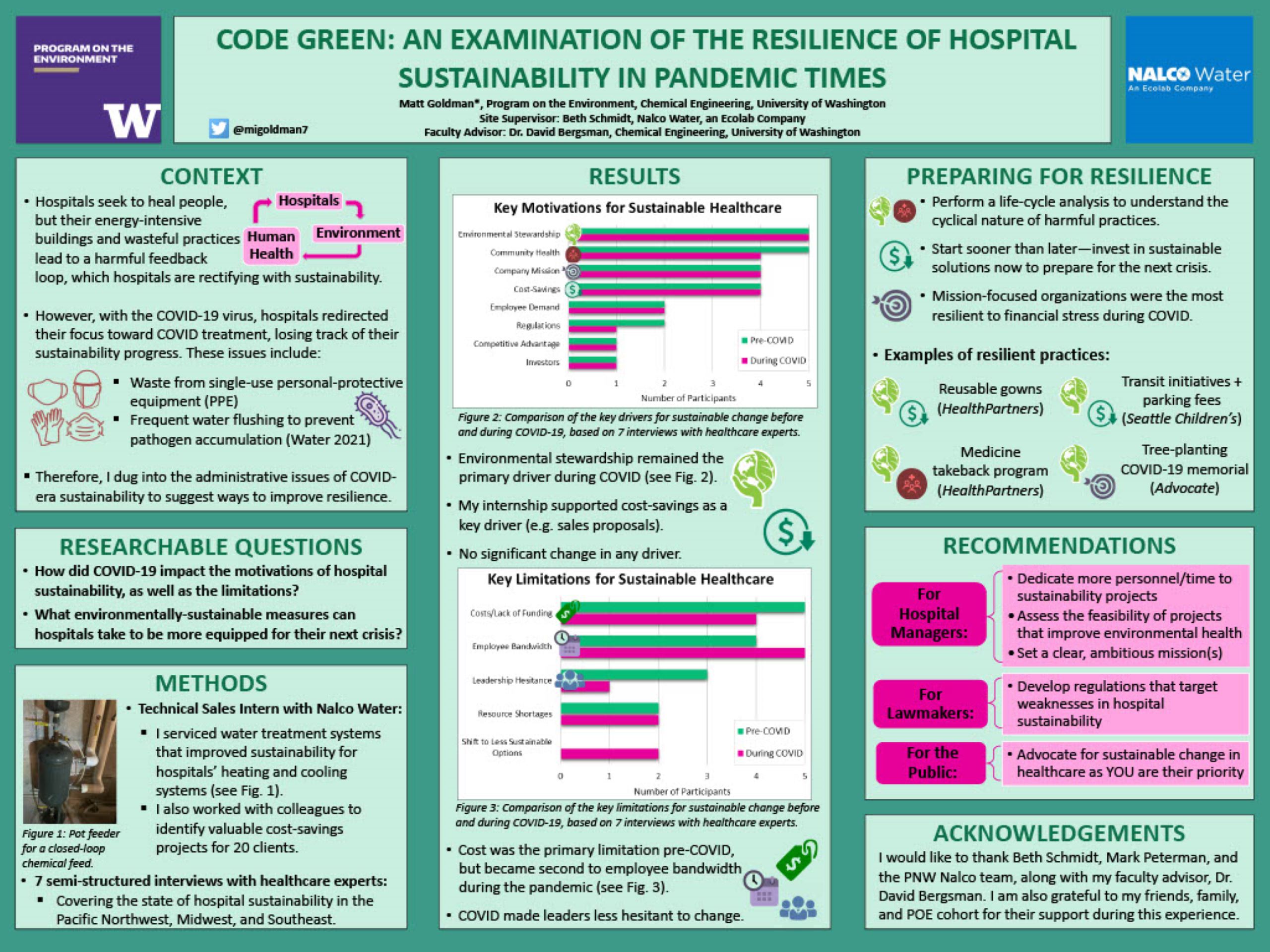 Hospitals are recognized as centers for healing the human population, but their energy-intensive and wasteful operations harm the environment, which inevitably harms humans that will need to seek care at these hospitals. With the pandemic, this unsustainable cycle only worsened as many hospitals shifted their focus and funding toward COVID-19 treatment. In this study, I sought to paint a picture of the state of hospital sustainability prior to and during the COVID-19 pandemic to assess its resilience in a time of crisis. As a technical sales intern with Nalco Water, I serviced various water treatment processes that aimed to improve hospital sustainability and minimize risk, while also collaborating with representatives to identify valuable cost-savings projects for 20 clients. Additionally, I conducted seven interviews with healthcare experts to understand any changes in sustainability resilience from the pandemic. From these methods, I learned that environmental stewardship remained at the forefront of hospitals’ mindsets, followed by community health and cost-savings. However, major revenue losses continued to act as the primary limitation for sustainable development, along with reduced employee bandwidth. Based on these findings, hospital leaders should pursue life cycle assessments to understand the cyclical nature of their harmful activities. Lawmakers can also use these trends to inform the development of regulations that target weaknesses in hospital sustainability. With this knowledge and guidance, hospitals will be better equipped to pursue sustainable solutions that enhance hospital resilience, preparing them to survive in future crises sooner than later.