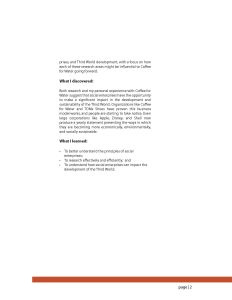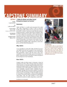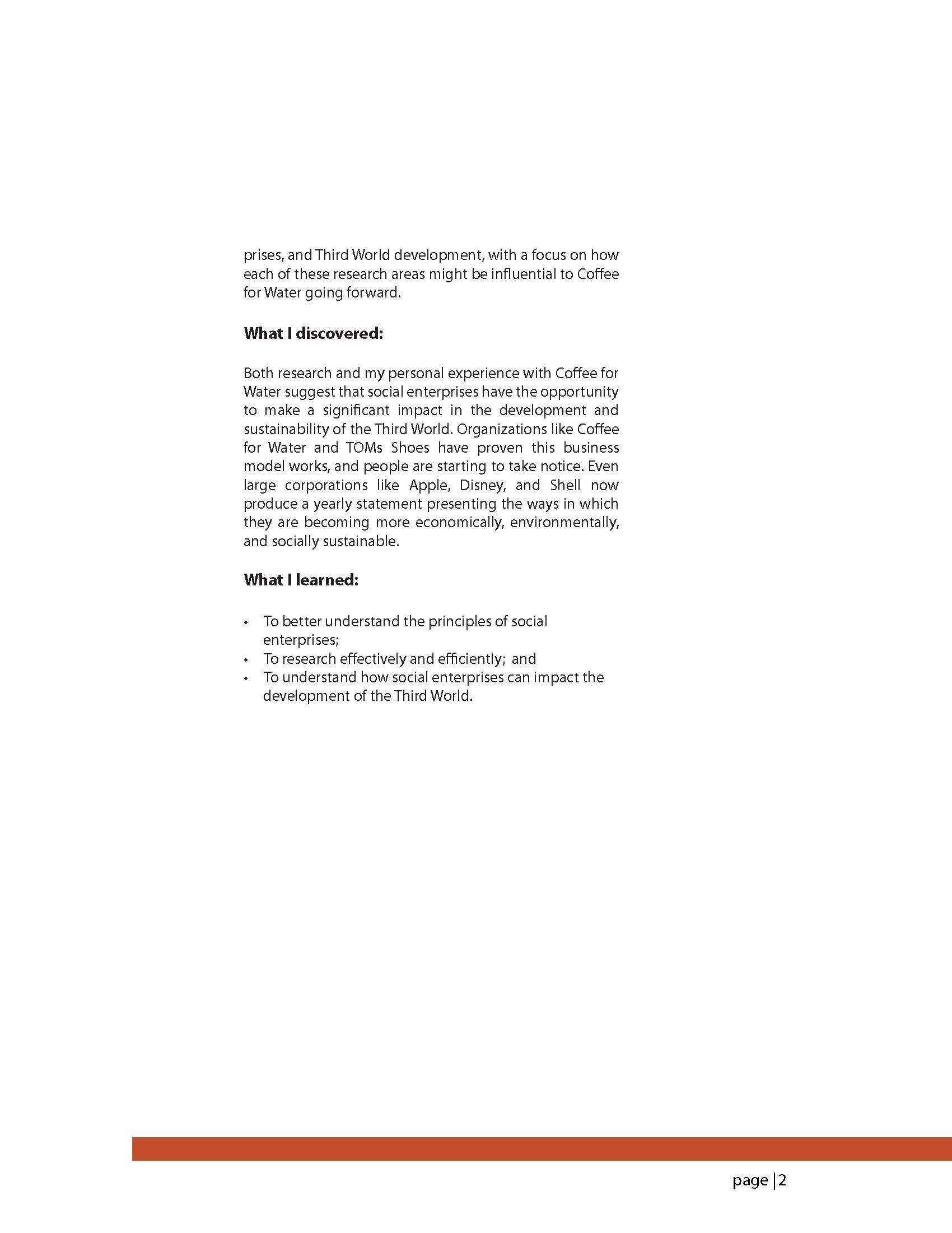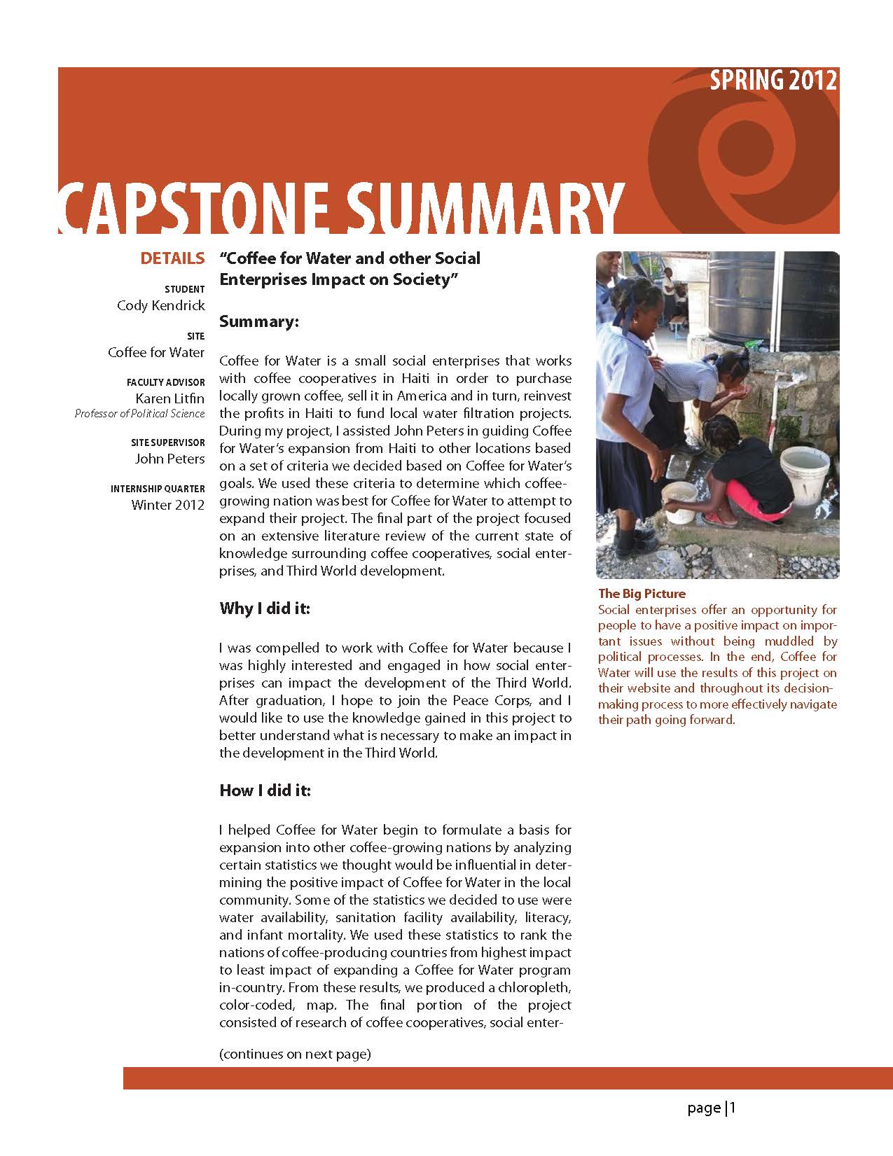 Coffee for Water is a small social enterprises that works with coffee cooperatives in Haiti in order to purchase locally grown coffee, sell it in America and in turn, reinvest the profits in Haiti to fund local water filtration projects. During my project, I assisted John Peters in guiding Coffee for Water’s expansion from Haiti to other locations based on a set of criteria we decided based on Coffee for Water’s goals. We used these criteria to determine which coffee-growing nation was best for Coffee for Water to attempt to expand their project. The final part of the project focused on an extensive literature review of the current state of knowledge surrounding coffee cooperatives, social enterprises, and Third World development.