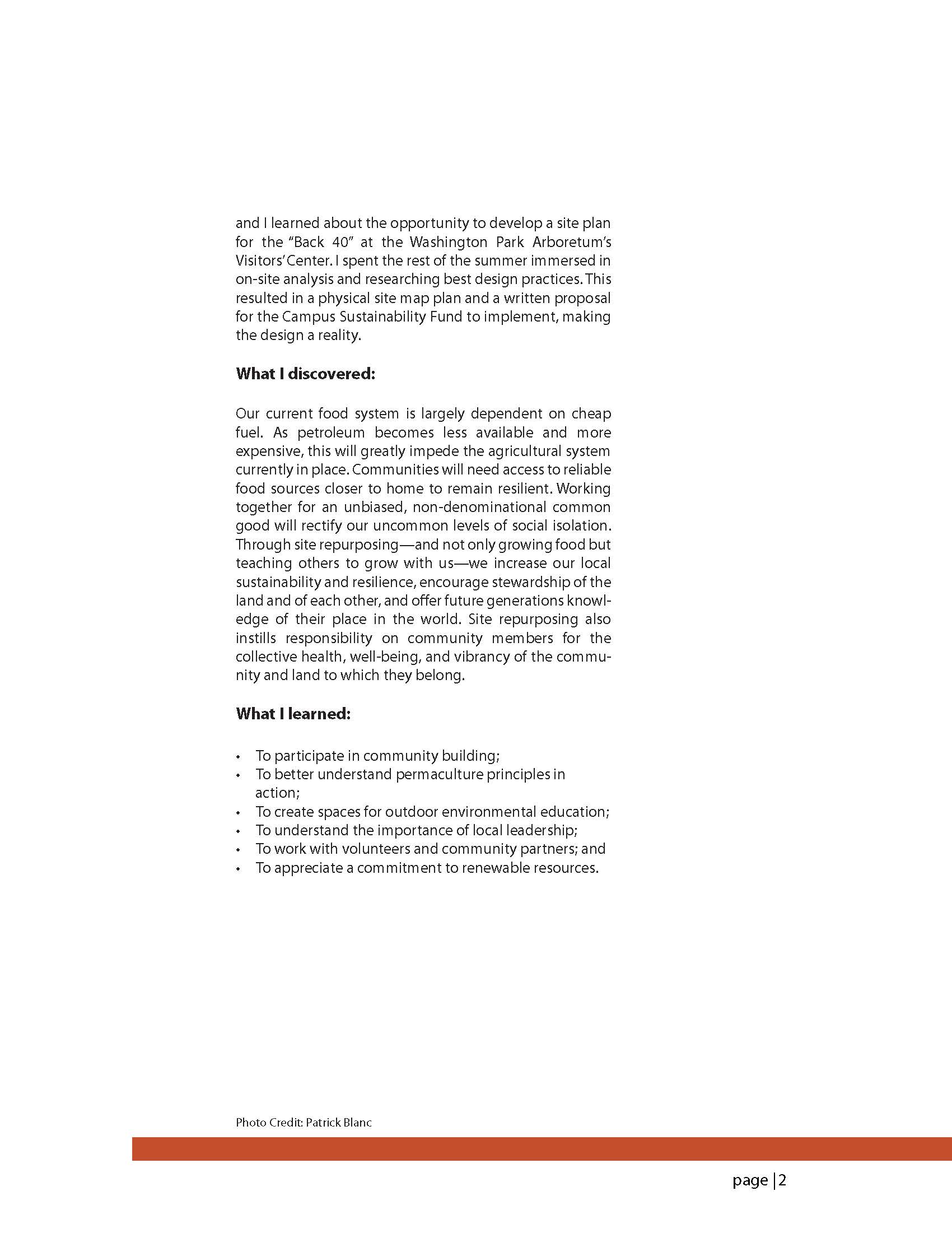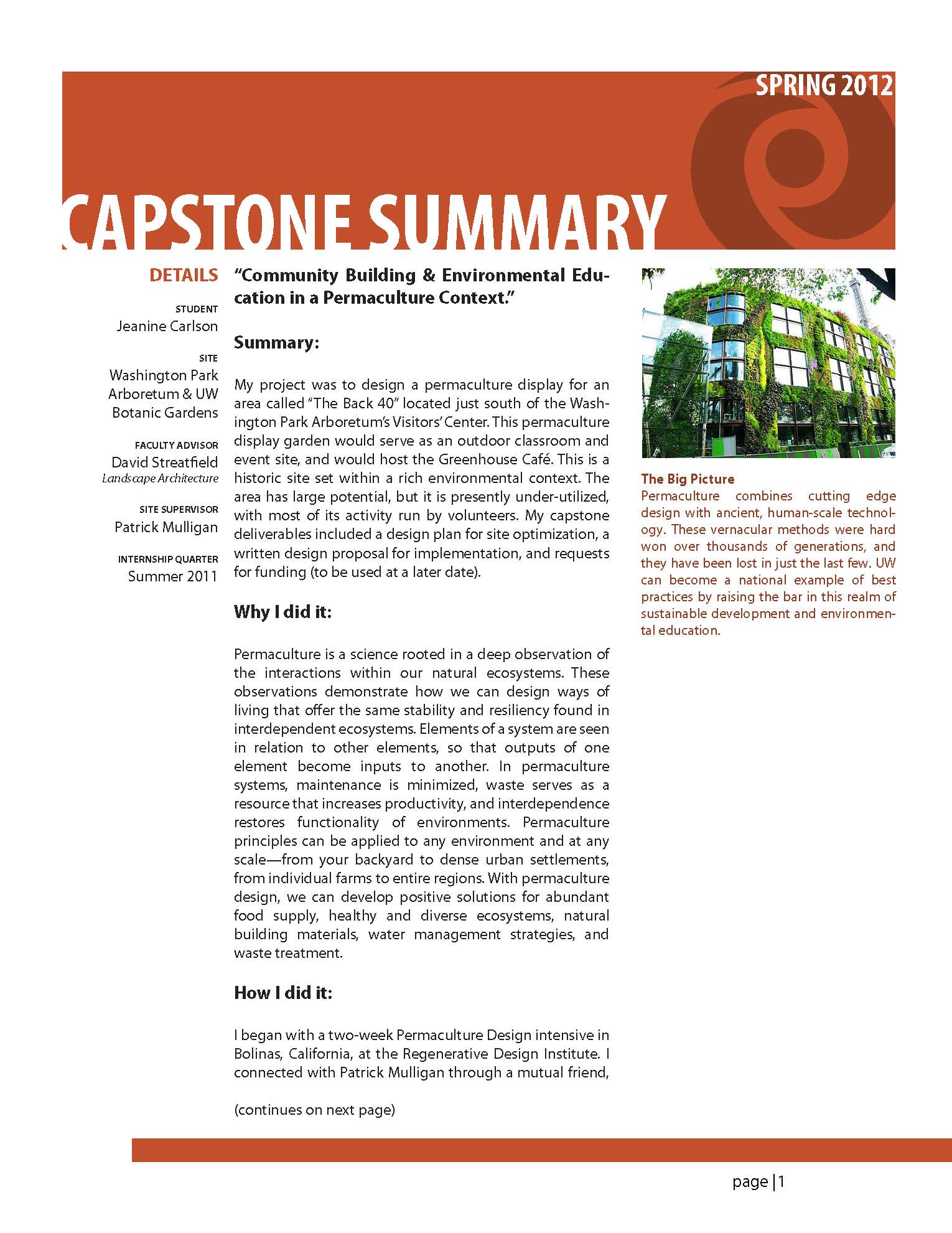 My project was to design a permaculture display for an area called “The Back 40” located just south of the Washington Park Arboretum’s Visitors’ Center. This permaculture display garden would serve as an outdoor classroom and event site, and would host the Greenhouse Café. This is a historic site set within a rich environmental context. The area has large potential, but it is presently underutilized, with most of its activity run by volunteers. My capstone deliverables included a design plan for site optimization, a written design proposal for implementation, and requests for funding (to be used at a later date).