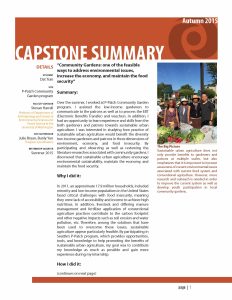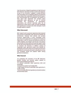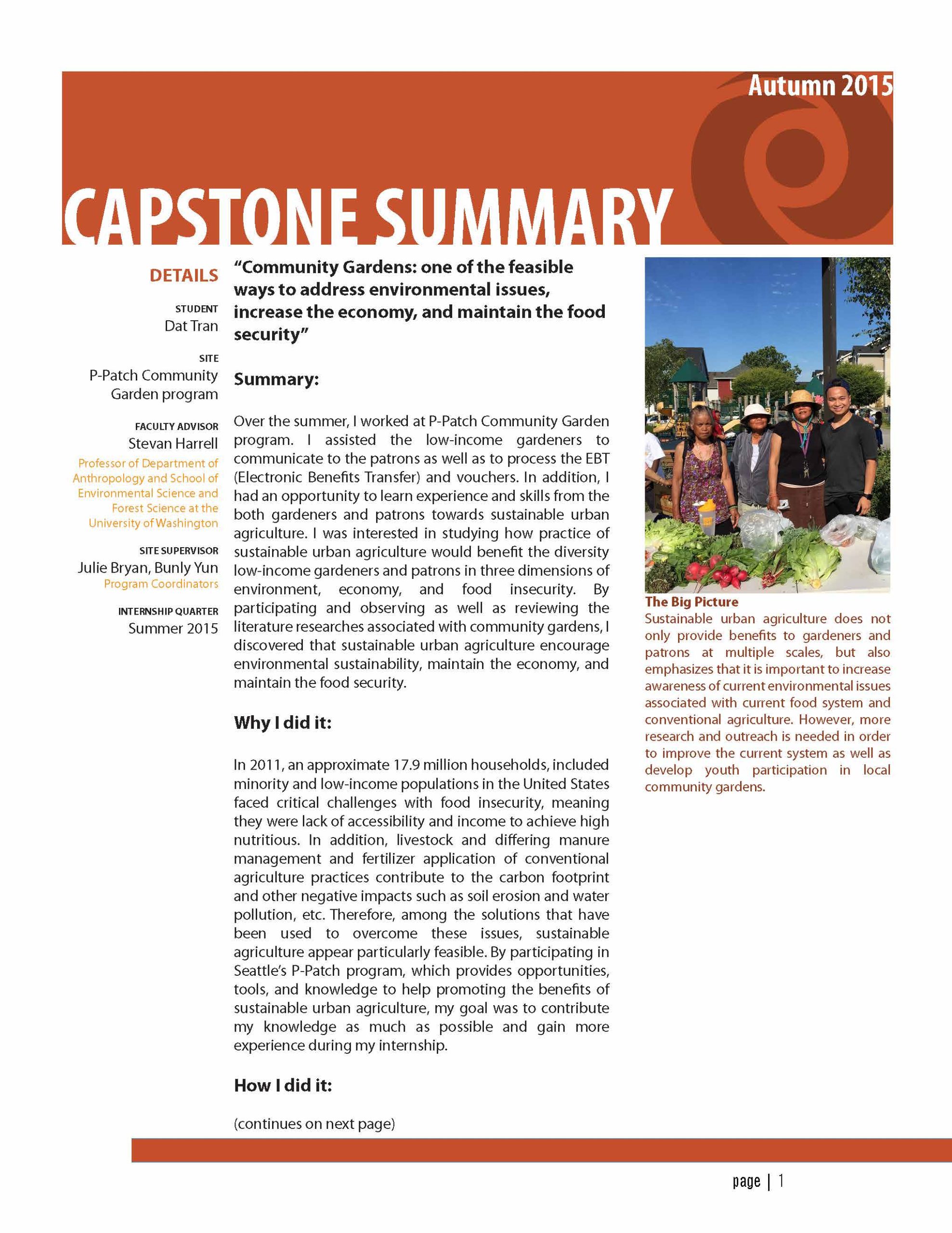 Over the summer, I worked at P-Patch Community Garden program. I assisted the low-income gardeners to communicate to the patrons as well as to process the EBT (Electronic Benefits Transfer) and vouchers. In addition, I had an opportunity to learn experience and skills from the both gardeners and patrons towards sustainable urban agriculture. I was interested in studying how practice of sustainable urban agriculture would benefit the diversity low-income gardeners and patrons in three dimensions of environment, economy, and food insecurity. By participating and observing as well as reviewing the literature researches associated with community gardens, I discovered that sustainable urban agriculture encourage environmental sustainability, maintain the economy, and maintain the food security.