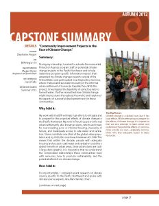 During my internship, I worked to educate Environmental Protection Agency program staff on potential climate change impacts in the Pacific Northwest and to help determine program-specific information needs. I then expanded my climate change research outside of the United States and participated in an Exploration Seminar, where I helped address water insecurity in the informal urban settlement of Lomas de Zapallal, Peru. With this project, I investigated the feasibility of using fog-nets to harvest water. I further researched how climate change might impact slums throughout the world, and I explored the aspects of successful development work in these communities.