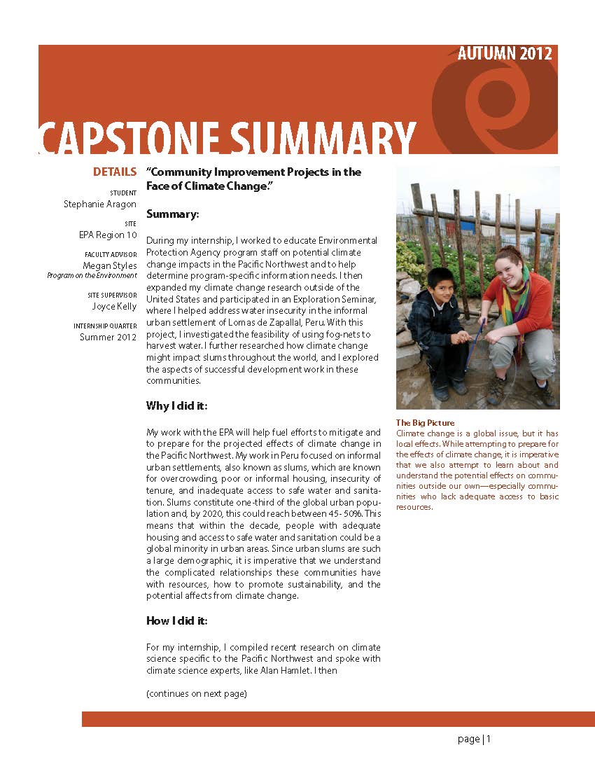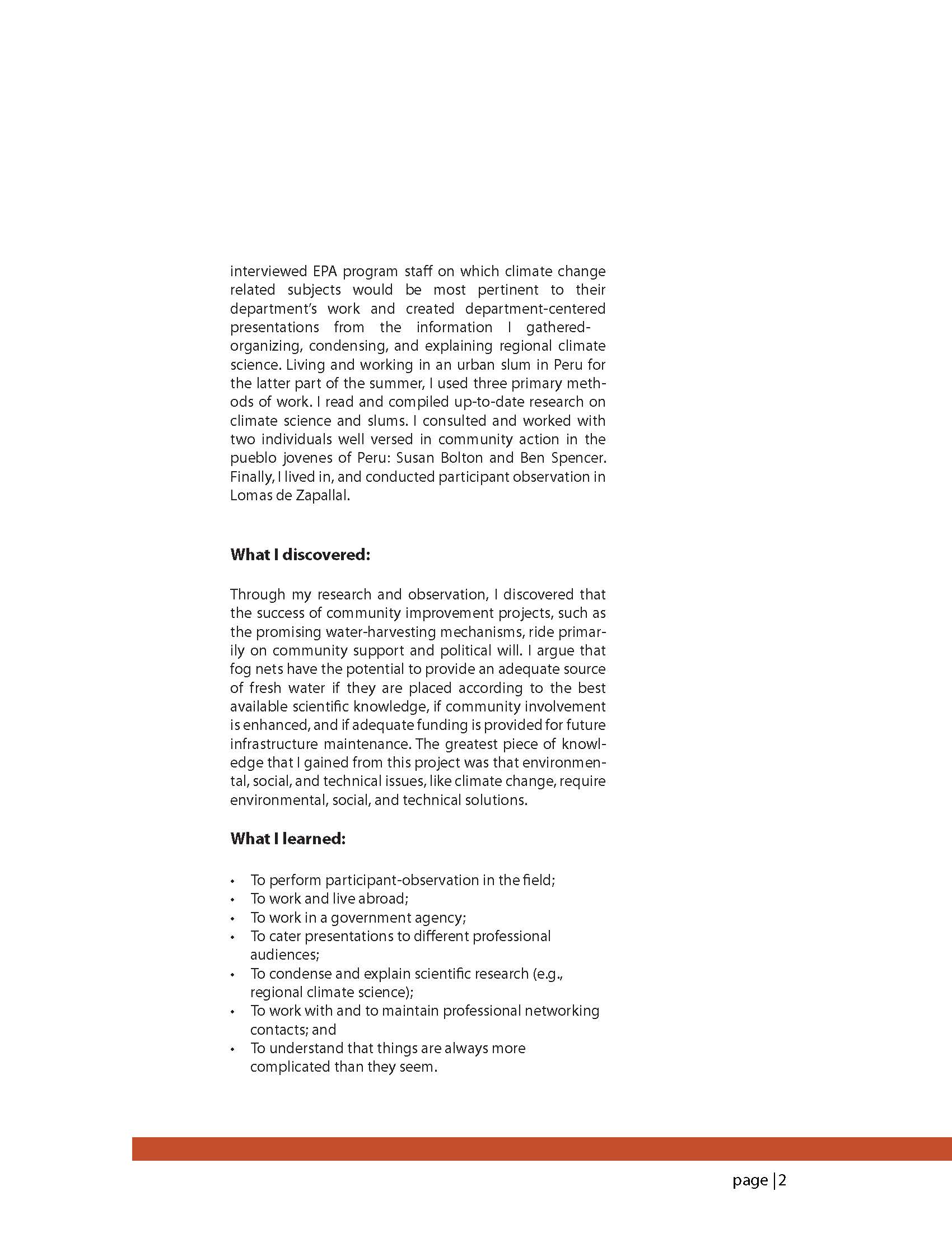 During my internship, I worked to educate Environmental Protection Agency program staff on potential climate change impacts in the Pacific Northwest and to help determine program-specific information needs. I then expanded my climate change research outside of the United States and participated in an Exploration Seminar, where I helped address water insecurity in the informal urban settlement of Lomas de Zapallal, Peru. With this project, I investigated the feasibility of using fog-nets to harvest water. I further researched how climate change might impact slums throughout the world, and I explored the aspects of successful development work in these communities.