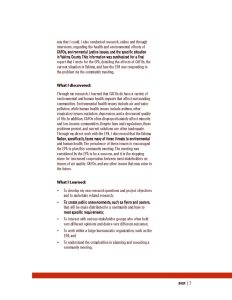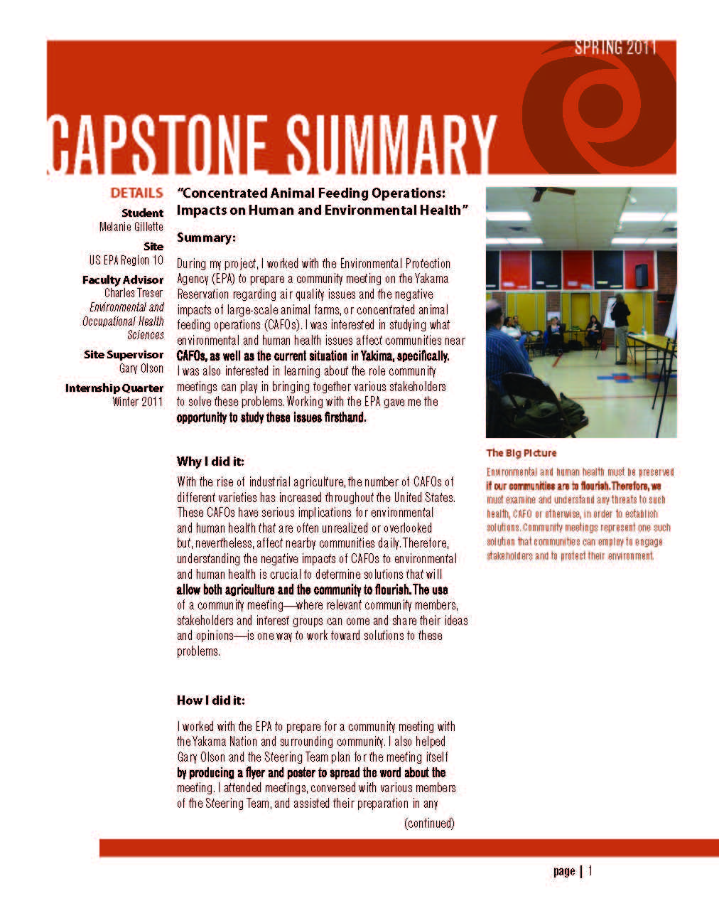 During my project, I worked with the Environmental Protection Agency (EPA) to prepare a community meeting on the Yakama Reservation regarding air quality issues and the negative impacts of large-scale animal farms, or concentrated animal feeding operations (CAFOs). I was interested in studying what environmental and human health issues affect communities near CAFOs, as well as the current situation in Yakima, specifically. I was also interested in learning about the role community meetings can play in bringing together various stakeholders to solve these problems. Working with the EPA gave me the opportunity to study these issues firsthand.