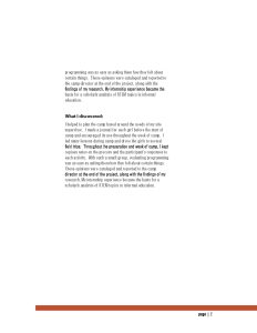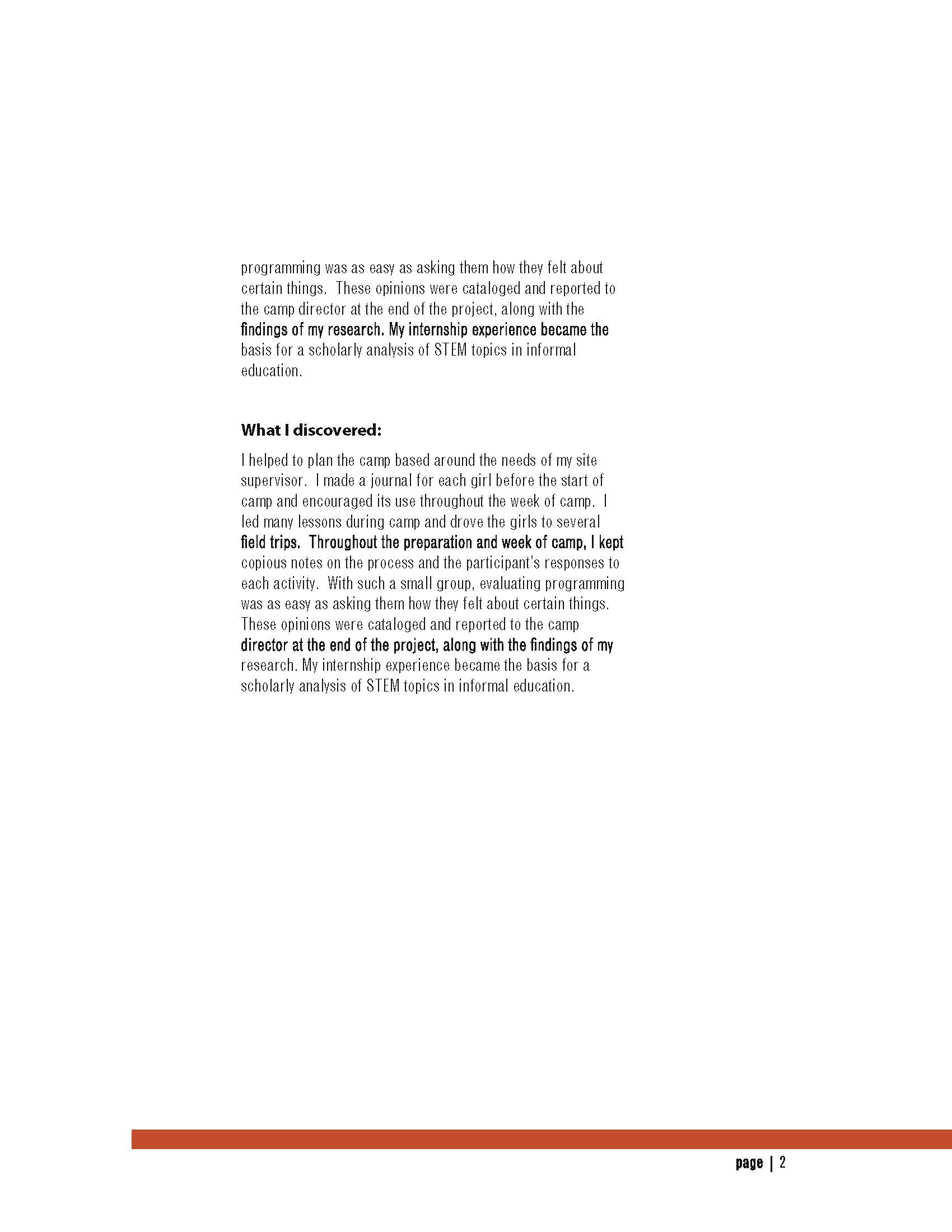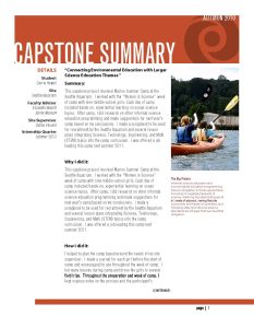 This capstone project involved Marine Summer Camp at the Seattle Aquarium. I worked with the “Women in Science” week of camp with nine middle-school girls. Each day of camp included hands-on, experiential learning on ocean science topics. After camp, I did research on other informal science education programming and made suggestions for next year’s camp based on my conclusions. I made a scrapbook to be used for recruitment by the Seattle Aquarium and several lesson plans integrating Science, Technology, Engineering, and Math (STEM) topics into the camp curriculum. I was offered a job leading this camp next summer 2011.