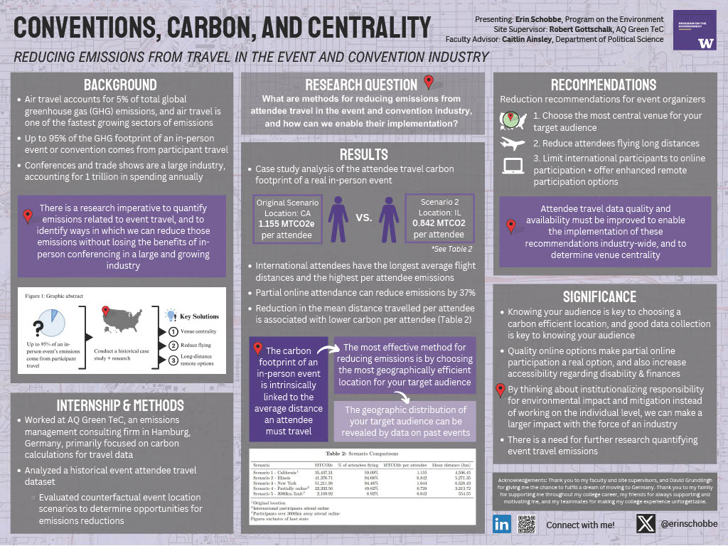 Up to 95% of the greenhouse gas (GHG) footprint of an in-person event or convention comes from participant travel. As the industry rebounds from Covid-19, it is important to consider creative ways of reducing emissions in this category to improve event sustainability and retain the benefits of in-person conferencing. The aim of this study was to investigate reduction opportunities for emissions from travel and propose sustainability strategies for event organizers. This was investigated through a case study on historical convention data with counterfactual scenarios, in addition to extensive academic research and hands-on experience in the industry working on carbon calculations at AQ Green TeC. Working with a large array of travel-related emissions data helped me learn carbon calculation methodology, as well as a sense for industry norms and opportunities for improvement. Through this study, I found that venue centrality in relation to participants’ origin locations and opportunity for land travel over aviation were key to a carbon efficient event. Additionally, the opportunity for enhanced remote participation can allow for a large reduction in emissions from long- distance attendees, and improve the accessibility of the event. Reducing emissions from participant travel is key to carbon efficient events as it remains the largest category of emissions for most in- person events. Therefore, good travel data collection is imperative, and significant carbon reductions here contribute heavily to the sustainability of the event and convention industry as a whole.