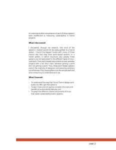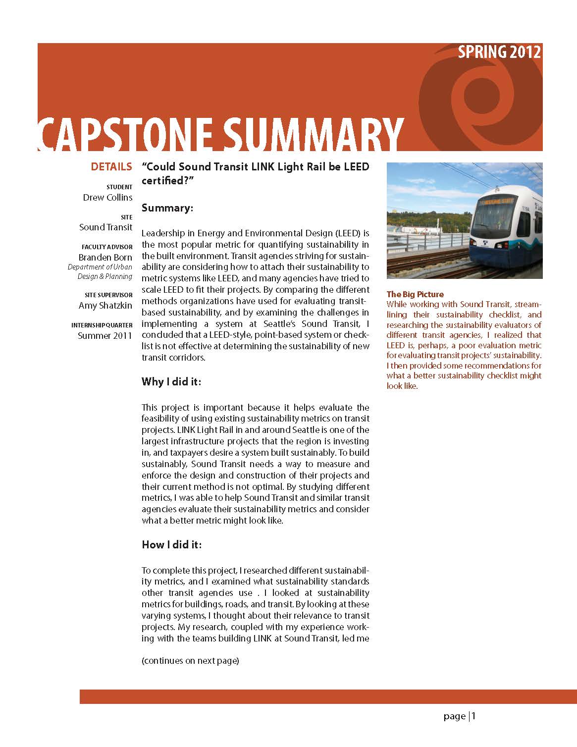 Leadership in Energy and Environmental Design (LEED) is the most popular metric for quantifying sustainability in the built environment. Transit agencies striving for sustainability are considering how to attach their sustainability to metric systems like LEED, and many agencies have tried to scale LEED to fit their projects. By comparing the different methods organizations have used for evaluating transit-based sustainability, and by examining the challenges in implementing a system at Seattle’s Sound Transit, I concluded that a LEED-style, point-based system or check- list is not effective at determining the sustainability of new transit corridors.