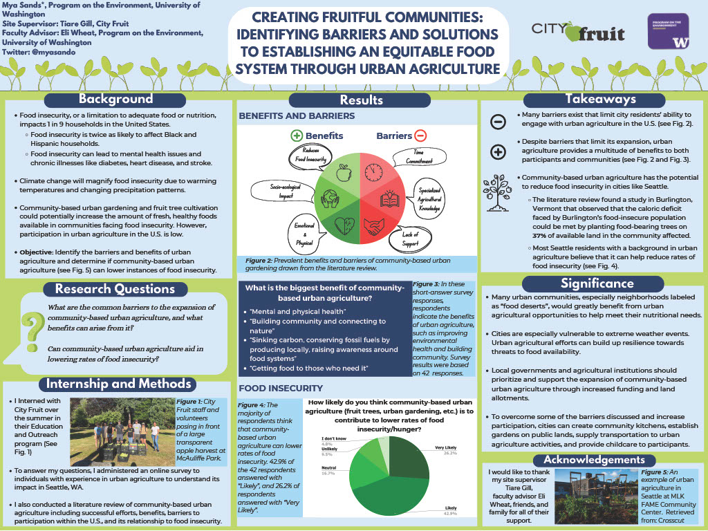 Food insecurity, or a limitation to adequate food or nutrition, is a prevalent issue today, impacting 1 in 9 households in the United States. Food insecurity is also twice as likely to affect Black and Hispanic households and can lead to chronic illness and mental health issues. The purpose of this study was to identify if community-based urban agriculture can lower instances of food insecurity within urban environments, as well as the barriers and benefits to engaging in this form of agriculture. To accomplish this task, I worked with the nonprofit City Fruit where I attended volunteer and education events and created resources on fruit trees and food equity. I also conducted a literature review of community-based urban agriculture including its relationship to food insecurity, successful efforts, and barriers to participation. Additionally, I administered an online survey to understand community perceptions of the benefits and limitations to urban agriculture. Findings show that urban agriculture aids in lowering rates of food insecurity. Urban agriculture also provides communities with emotional, physical, and socio-ecological benefits. Major barriers to engaging in urban agriculture include large time commitments, a need for specialized agricultural knowledge, and a lack of support from city officials and agricultural agencies. Given that community-based urban agriculture both lowers rates of food insecurity and provides a multitude of benefits, local governments and agricultural institutions should prioritize and support its expansion. If the current rates of food insecurity are reduced, we can begin to create a more equitable society.