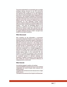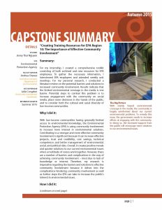 For my internship, I created a comprehensive toolkit consisting of both archived and new resources for EPA employees. To gather the necessary information, I interviewed EPA employees and attended weekly unit meetings. For my personal research, I conducted a literature review on the potential barriers and solutions to increased community involvement. Results indicate that the limited environmental coverage in the media is one barrier. Potential steps to combat this problem is to increase engagement with the community on social media, place more decisions in the hands of the public, and to consider both the cultural and racial diversity of low-income communities.