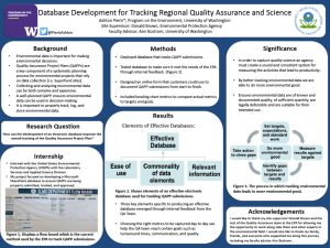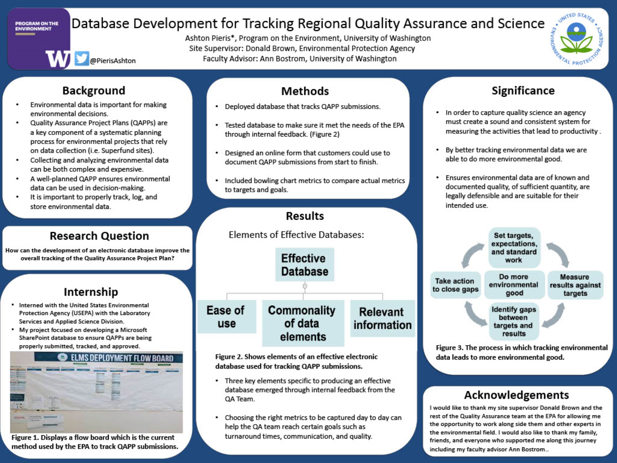 Government agencies and other organizations increasingly use scientific data to make important environmental decisions. In order to capture quality data an agency must have a sound and consistent system to track, store, and log the data that is collected. One way to accomplish this is through the development of an electronic database that serves these functions. The purpose of this study was to see how tracking environmental data ultimately leads to better environmental projects and decision-making throughout the Environmental Protection Agency’s (EPA) Region 10 program offices- land, air, and water in hopes of maintaining quality and confidence. To accomplish this task my main responsibility was to deploy an electronic database to track Quality Assurance Project Plan (QAPP) submissions using an existing Access Database. QAPPs are one way in which the EPA maintains a robust quality system to provide the needed management and technical practices to assure that the environmental data used to support Agency decisions are of upmost quality. My findings showed that to produce a fully functioning database that captures the essence of quality science it must contain three elements: ease of use, capture useful information, and maintain common data elements across different environmental programs. By maintaining a desired level of quality that can be captured through electronic databases agencies are able to set targets, meet expectations, and set standards that lead to better decision-making and overall environmental good.