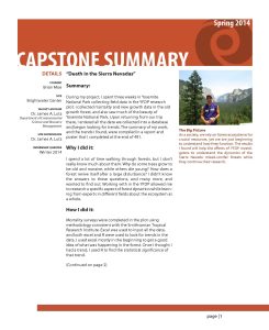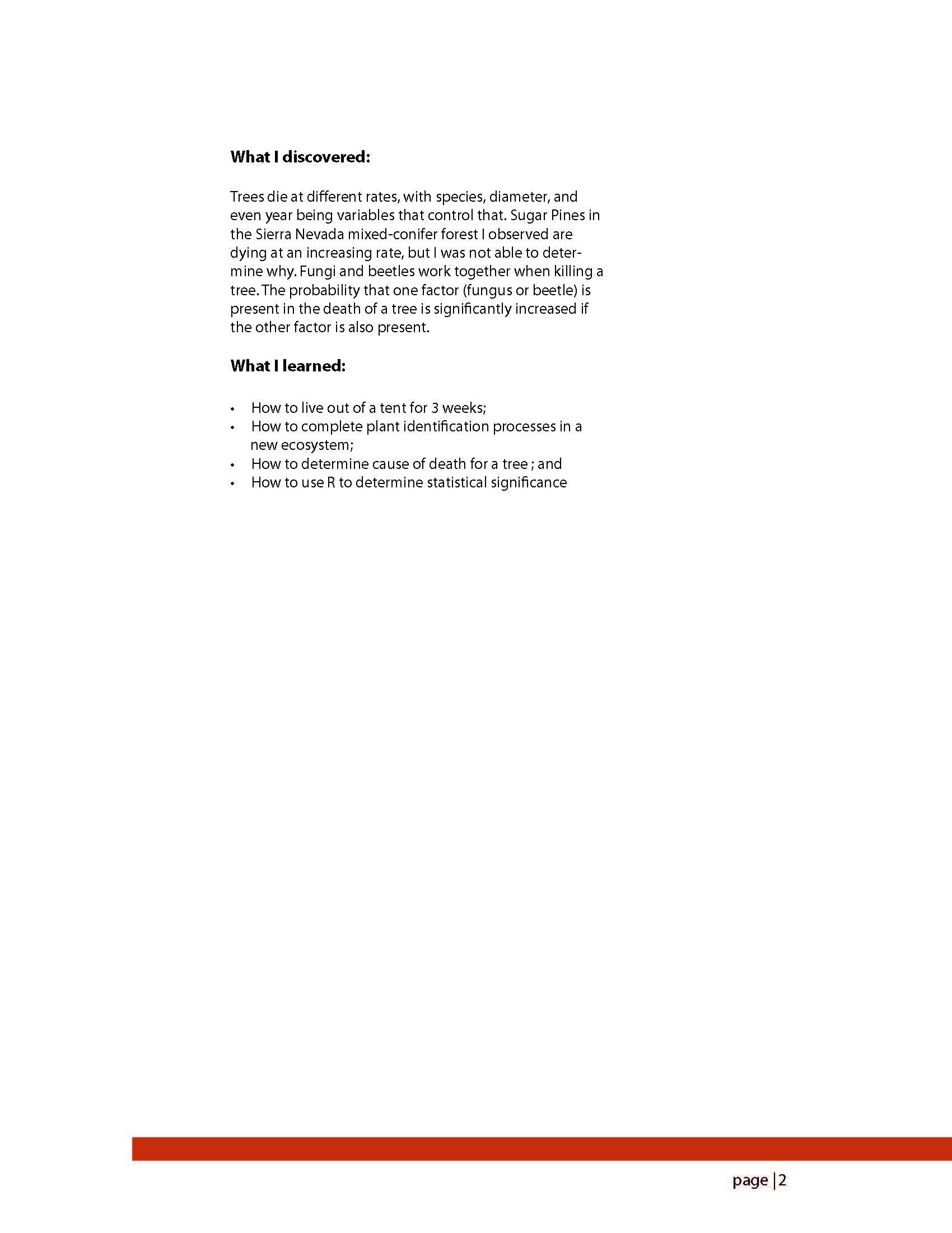 During my project, I spent three weeks in Yosemite National Park collecting field data in the YFDP research plot. I collected mortality and new growth data in the old growth forest, and also saw much of the beauty of Yosemite National Park. Upon returning from our trip there, I entered all the data we collected into a database and began looking for trends. The summary of my work, and the trends I found, were compiled in a report and poster that I completed at the end of 491.