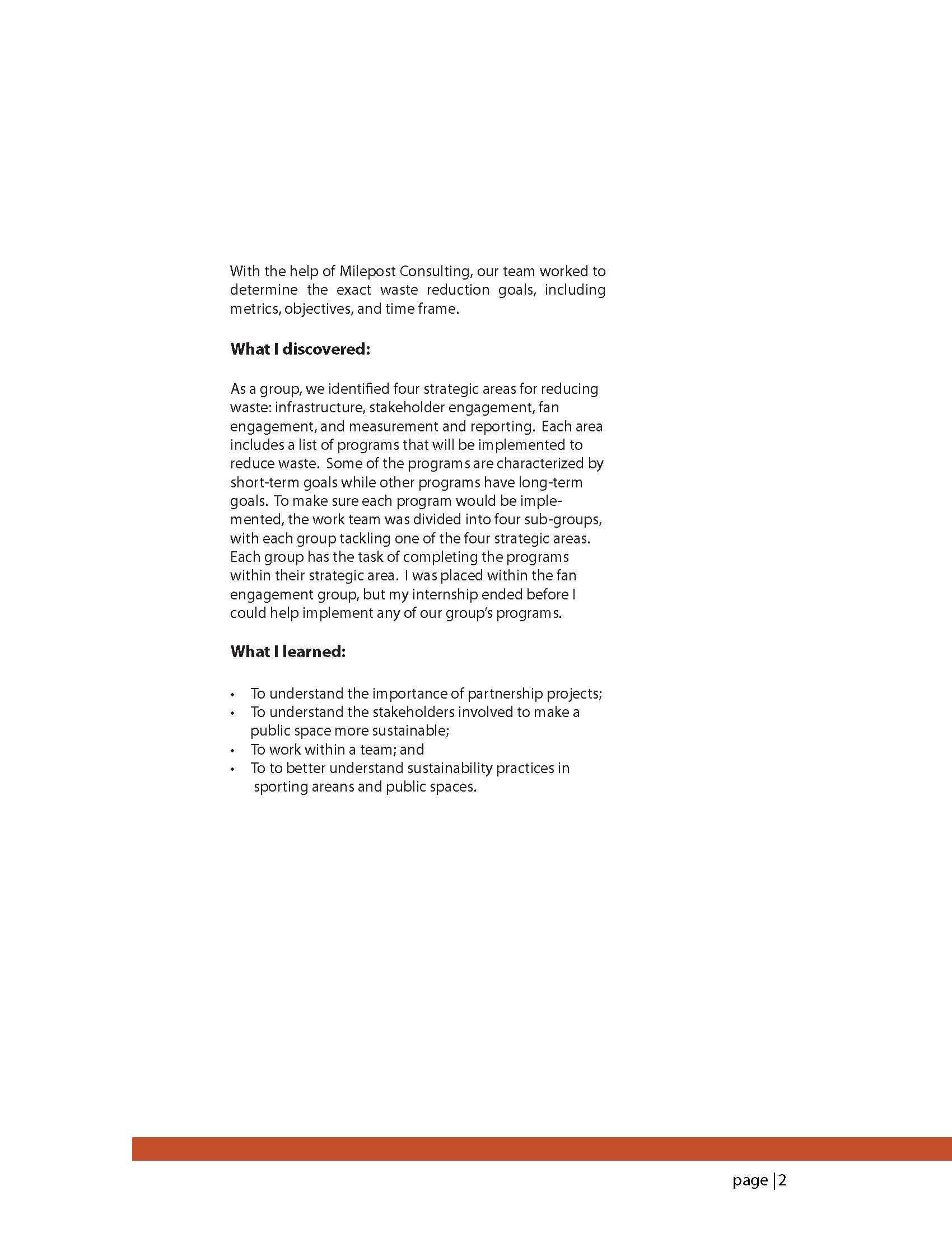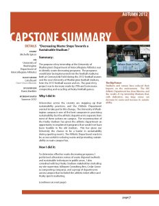 The purpose of my internship at the University of Washington’s Department of Intercollegiate Athletics was to identify waste decreasing programs. The programs would later be implemented into the football stadiums: both at CenturyLink Field during the 2012 football season and the new University of Washington football stadium, from the 2013 football season and on. The goal of my project was to decrease waste by 70% and to increase composting and recycling at Husky football games.