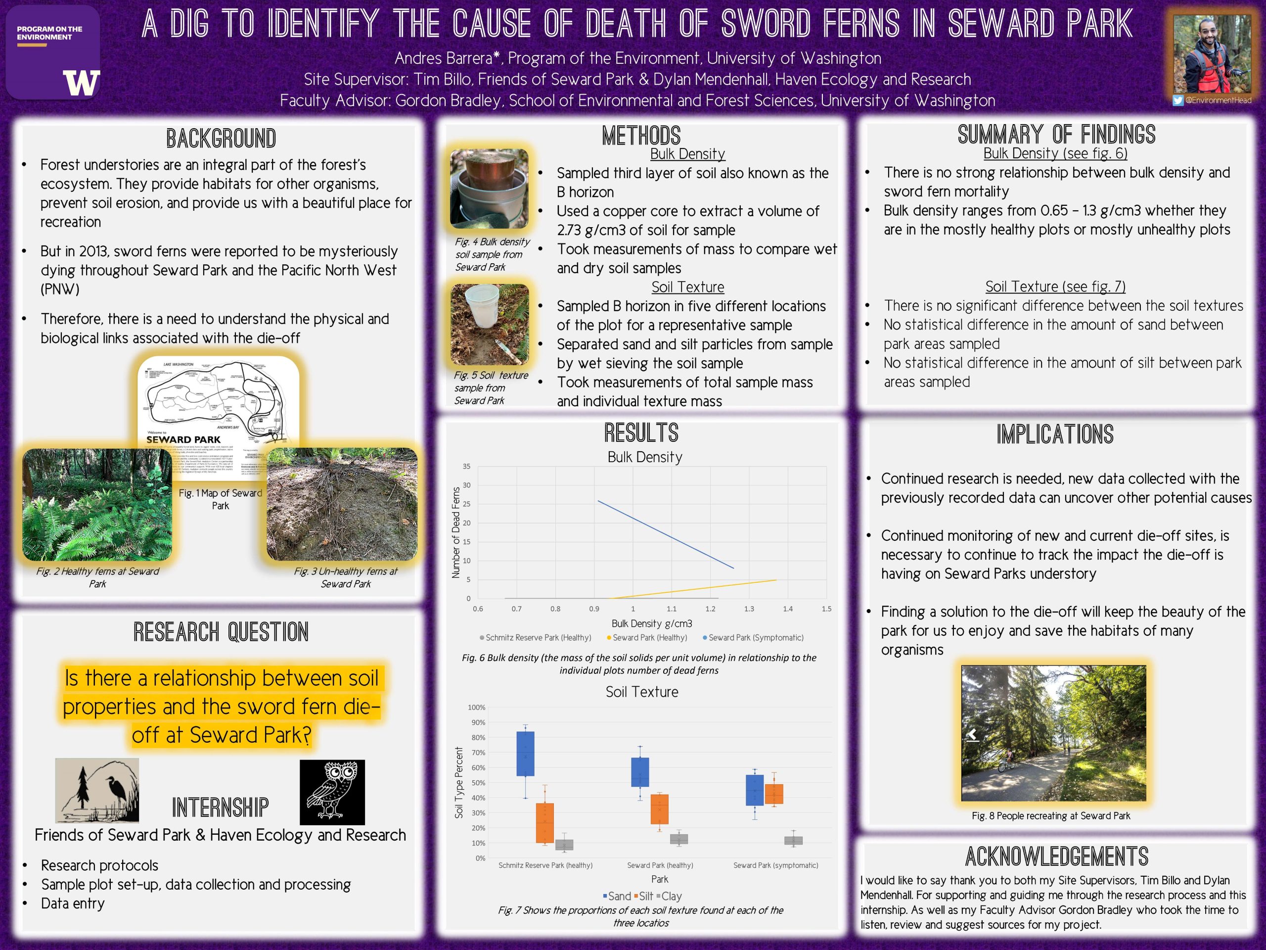 For the past decade, sword ferns across the Pacific North West have been sharply declining with no identified cause; these ferns are an essential part of a forest’s ecosystem and are supported by the soils around them. Healthy soils provide plants the ability to access nutrients, retain water, and allow for air exchange, and although sword ferns are resilient plants, without the proper soils, a sword fern’s growth can be disrupted. The purpose of this research is to help narrow down a potential cause to the sword fern die-off. To accomplish this, I interned with Friends of Seward Park and Haven Ecology & Research, which have been allocating time and resources into identifying a potential cause of this phenomenon. As part of my internship, I collected soil samples from Seward Park and Schmitz Preserve Park; from the plots we laid out, I collected bulk density samples, followed by a set of soil texture samples. Results show that bulk density is at levels that are associated with proper root growth and moisture content is not low enough to constitute drought as a potential cause. Furthermore, Seward park symptomatic ferns have a higher moisture content. However, they are still producing fewer fronds than those sword ferns found at Schmitz Preserve Park, that are experiencing a lower availability of moisture. These results are significant because they help narrow down the probable causes associated with the die-off; thus setting up the prospect for further research on other aspects of the sword fern’s environment.