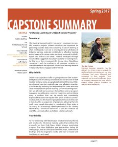 Effective training methods for non-expert volunteers in scien- tific research projects (citizen scientists) are important for gathering accurate data. Since ongoing in-person training is often not feasible, I set out to investigate what attributes of distance learning materials contribute to effective training and to create a 30-minute video outlining protocols for Wash- ington Sea Grant’s Crab Team. Patterns emerged through research that suggested crucial components to training mate- rial that were then incorporated into my video. Repetition, consistency, and the application of volunteer activities to scientific research are important for distance learning material to keep volunteers engaged and informed.