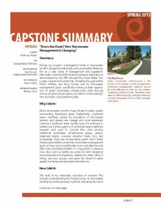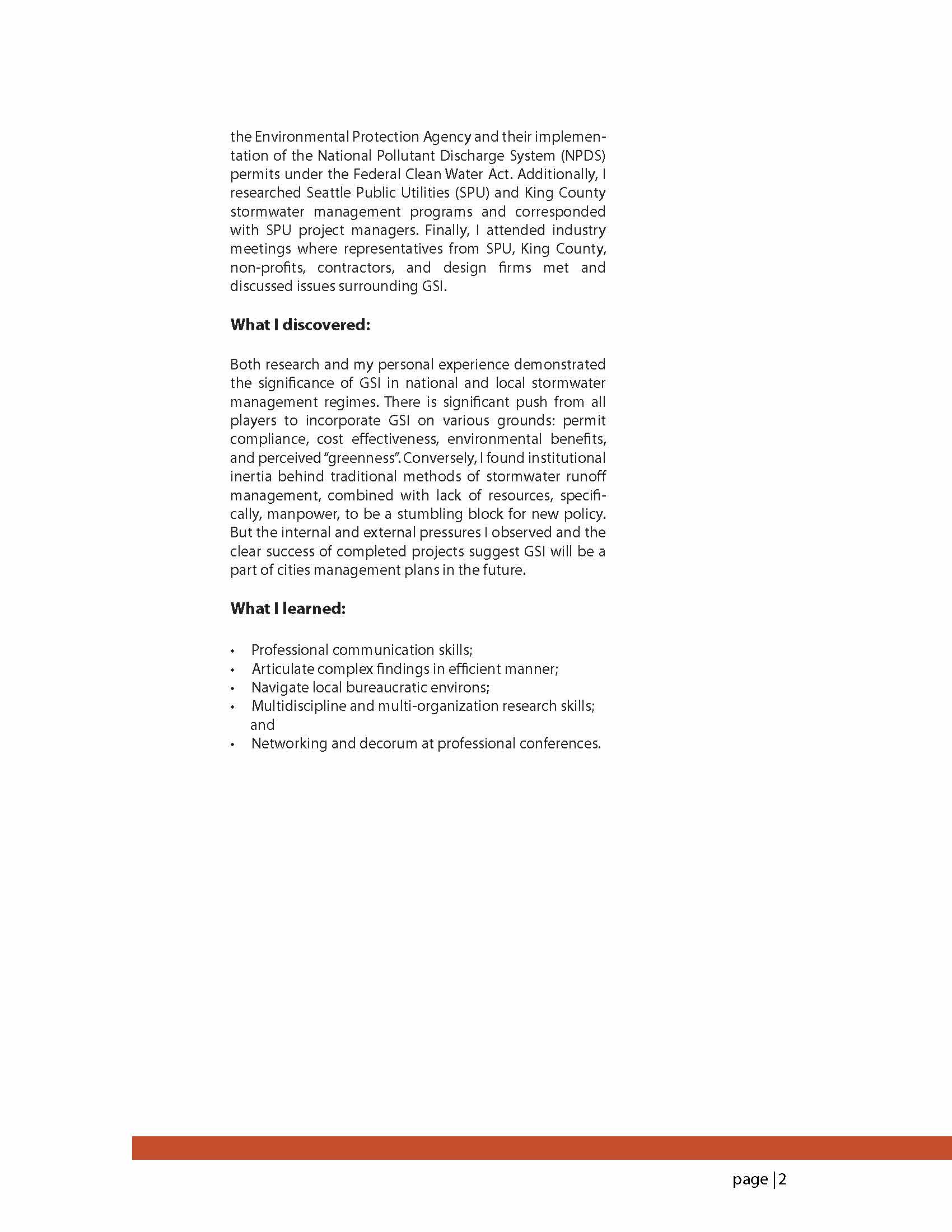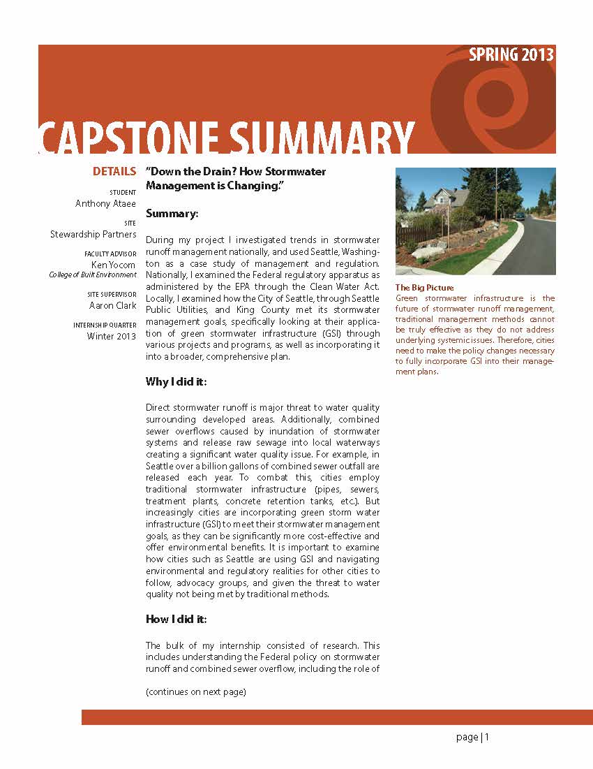 During my project I investigated trends in stormwater runoff management nationally, and used Seattle, Washington as a case study of management and regulation. Nationally, I examined the Federal regulatory apparatus as administered by the EPA through the Clean Water Act. Locally, I examined how the City of Seattle, through Seattle Public Utilities, and King County met its stormwater management goals, specifically looking at their application of green stormwater infrastructure (GSI) through various projects and programs, as well as incorporating it into a broader, comprehensive plan.