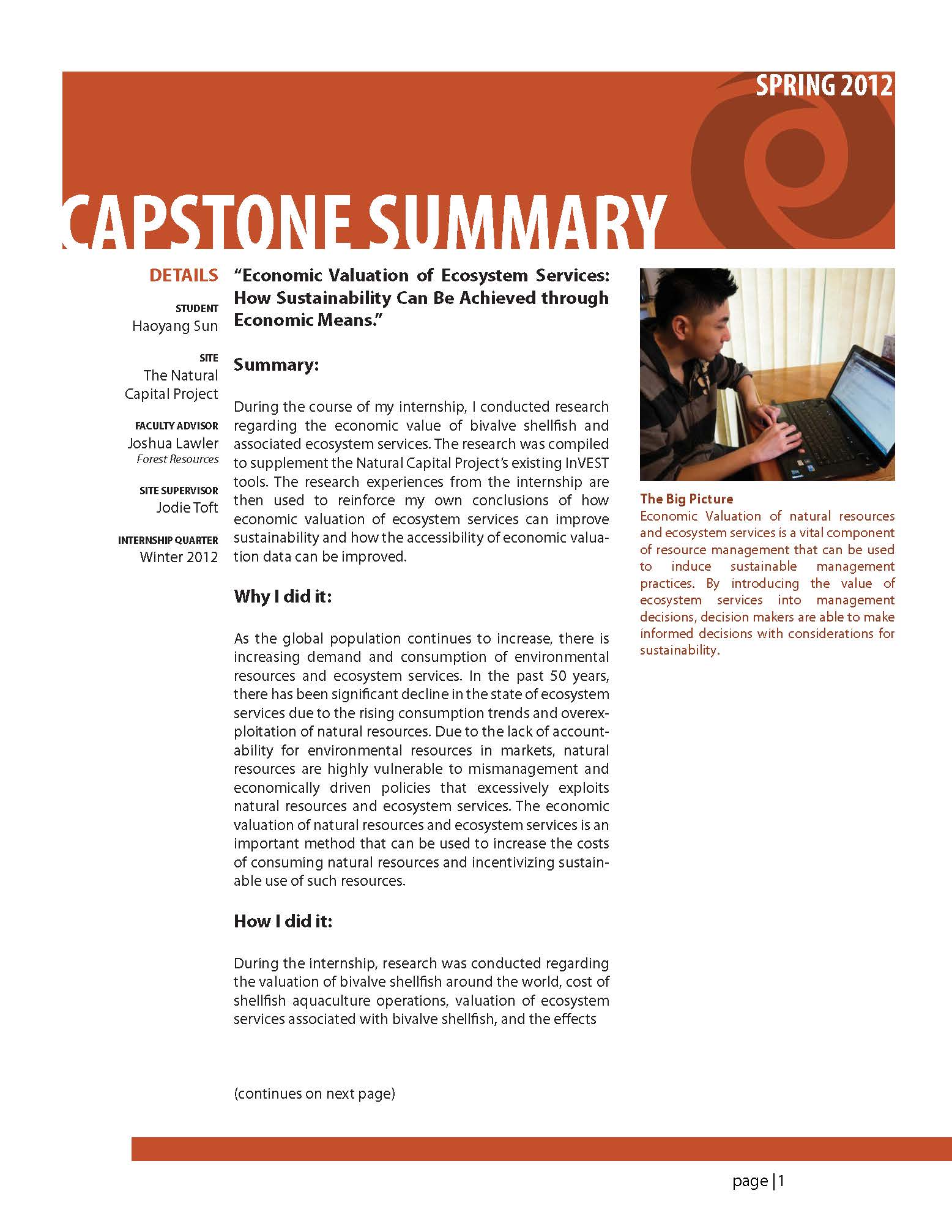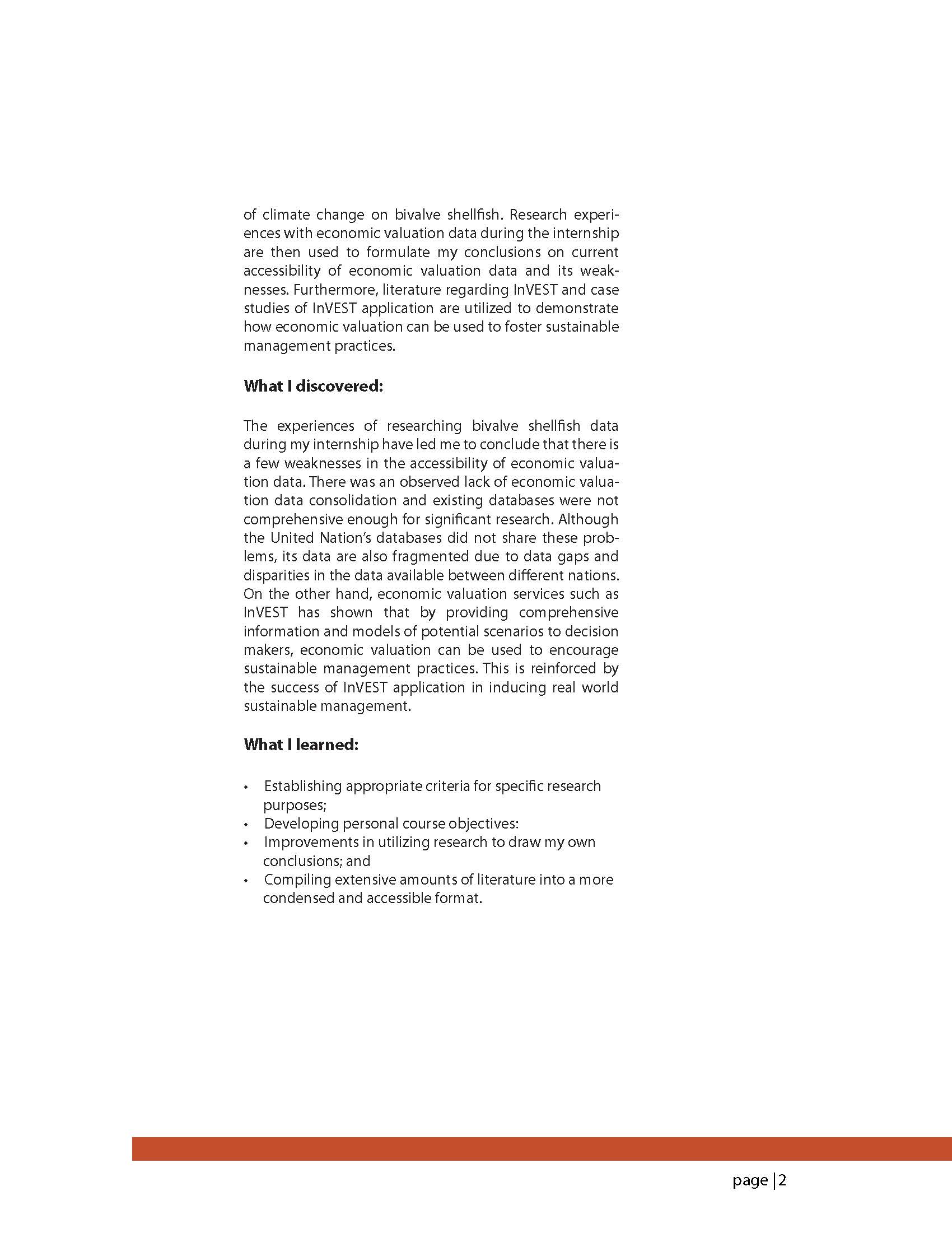 During the course of my internship, I conducted research regarding the economic value of bivalve shellfish and associated ecosystem services. The research was compiled to supplement the Natural Capital Project’s existing InVEST tools. The research experiences from the internship are then used to reinforce my own conclusions of how economic valuation of ecosystem services can improve sustainability and how the accessibility of economic valuation data can be improved.