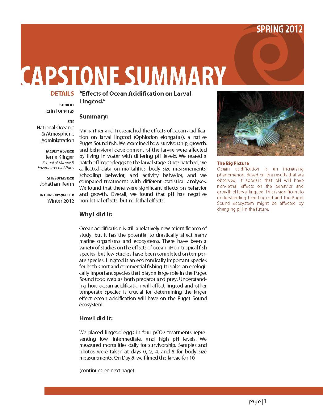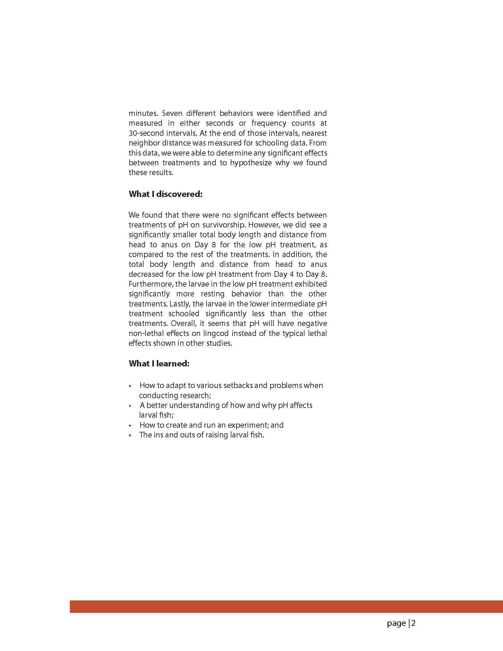 My partner and I researched the effects of ocean acidification on larval lingcod (Ophiodon elongatus), a native Puget Sound fish. We examined how survivorship, growth, and behavioral development of the larvae were affected by living in water with differing pH levels. We reared a batch of lingcod eggs to the larval stage. Once hatched, we collected data on mortalities, body size measurements, schooling behavior, and activity behavior, and we compared treatments with different statistical analyses. We found that there were significant effects on behavior and growth. Overall, we found that pH has negative non-lethal effects, but no lethal effects.