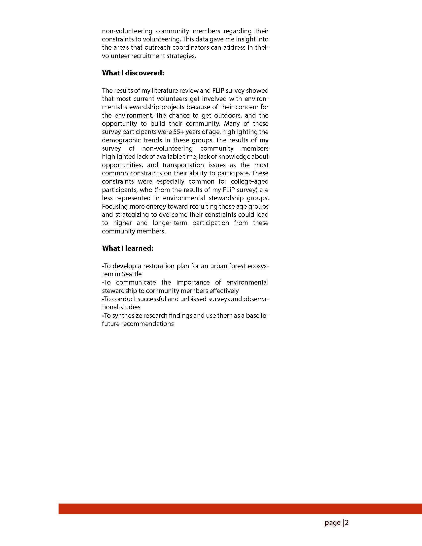 During my project, I worked in an urban Seattle forest putting a 2,000 acre plot of land into restoration. Over the course of these three months, I participated in the same type of stewardship work that FLiP volunteers do and I learned about how community-based restoration groups function. I was interested in understanding why people volunteer for these projects and what constraints limit community involvement, as well as how this information could inform outreach strategies to recruit more volunteers. My hands-on experience with this type of organization helped to inform my research questions.