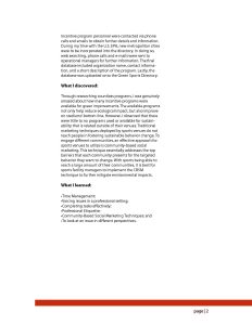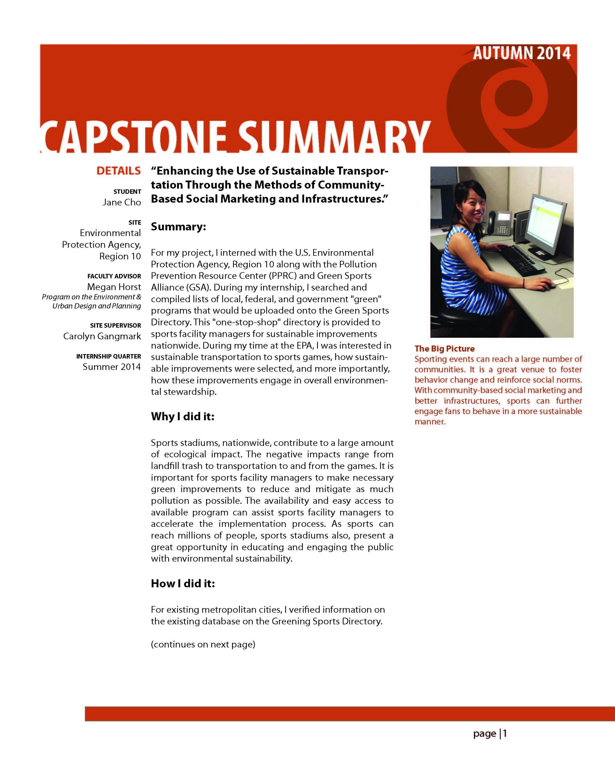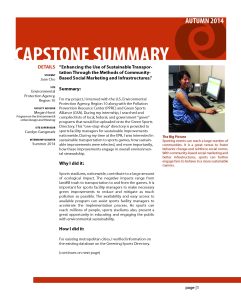 For my project, I interned with the U.S. Environmental Protection Agency, Region 10 along with the Pollution Prevention Resource Center (PPRC) and Green Sports Alliance (GSA). During my internship, I searched and compiled lists of local, federal, and government “green” programs that would be uploaded onto the Green Sports Directory. This “one-stop-shop” directory is provided to sports facility managers for sustainable improvements nationwide. During my time at the EPA, I was interested in sustainable transportation to sports games, how sustain- able improvements were selected, and more importantly, how these improvements engage in overall environmental stewardship.