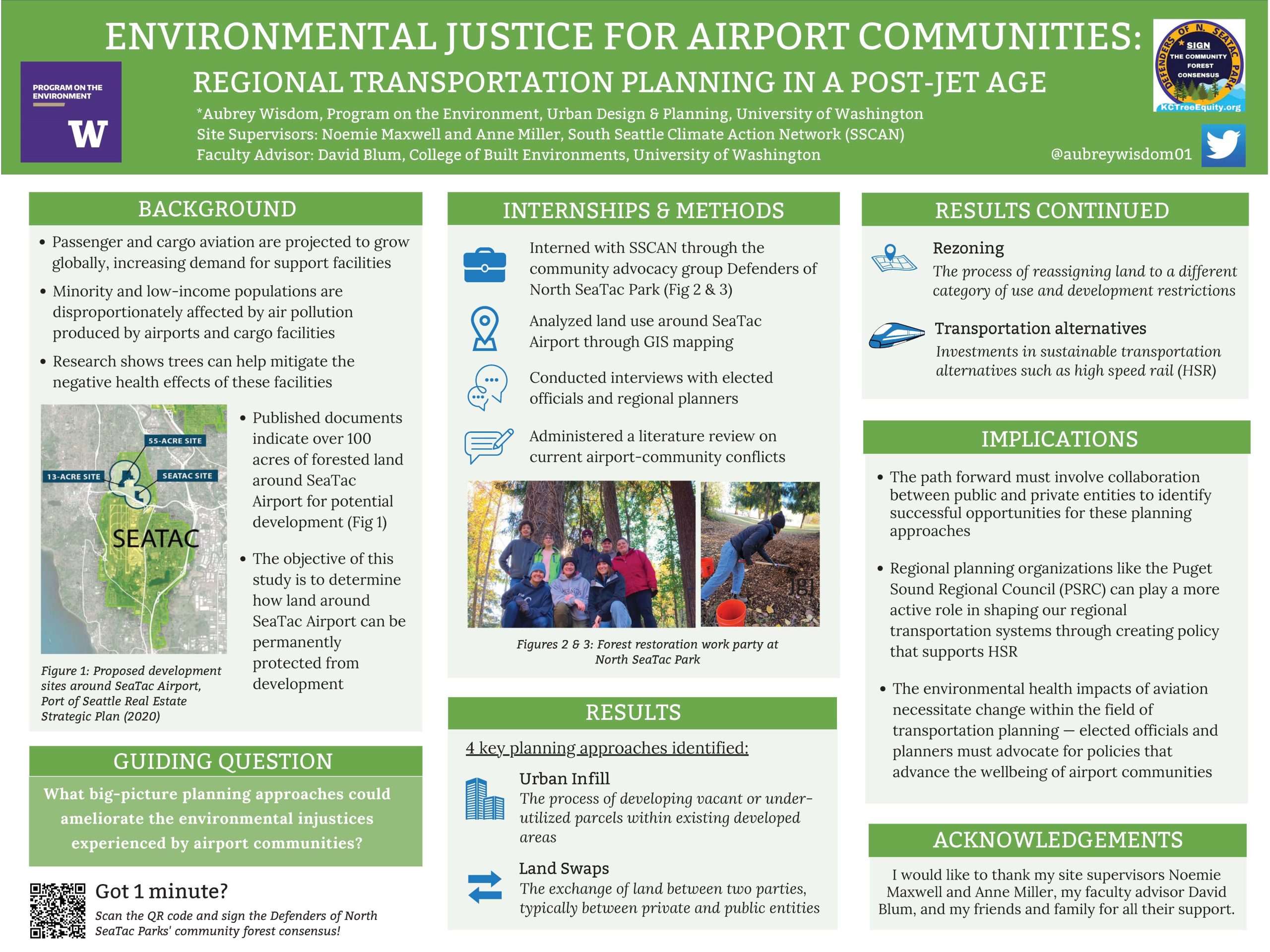 According to recent projections, demand for additional airport capacity support continues to grow as both passenger and cargo aviation increases globally. Although the industry comprises a large part of our modern-day transportation and logistics systems, there is insufficient awareness regarding the health and environmental impacts that airports have on nearby communities. Minority and low-income populations are disproportionately affected by air pollution produced by airports and cargo facilities. Despite research showing that trees help mitigate the negative health impacts of these facilities, expansion plans published by the Port of Seattle implicate over 100 acres of forested land around SeaTac Airport for development. The purpose of this study was to evaluate the land use around SeaTac Airport to determine the best pathway forward for protecting this forested land, as well as understanding the larger-scale transportation planning approaches that could ameliorate the environmental injustices experienced by airport communities. To accomplish this task, I evaluated the Port’s published development plans and conducted a GIS analysis of land use and tree canopy distribution around SeaTac Airport. I also completed a literature review of airport-community conflicts in the United States and interviewed elected officials and contacts at regional planning organizations. My analysis suggests the path forward must involve collaboration between public and private entities to identify successful opportunities for infill, land swaps, and rezoning of forested land currently designated as aviation commercial. Alternatives such as high-speed rail must be pursued as the environmental health impacts of aviation necessitate change within the field of transportation planning.