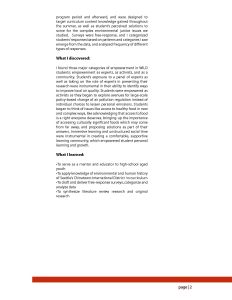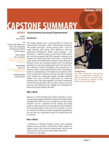 This project expands upon a growing body of research on environmental education, urban environmental education, and outdoor education. During summer 2016, I spent 10 weeks teaching with InterIm CDA’s Wilderness Inner-City Leadership Development (WILD) youth program. I was interested in exploring urban environmental youth education, and how programs like WILD empower students to be catalysts for change within their communities. I used WILD as a case study, and combined free-response survey data with a literature review and anecdotal evidence from my teaching experiences to see how program place and curriculum structure influenced student knowledge and empowerment to become active in environmental justice issues. Post-program, students’ understanding of the depth and complexity of the issues covered had increased, and they were able to identify more solutions for widespread change. Students identified outdoor and social activities, particularly the week-long camping trip, as the most impactful curriculum components to their learning with WILD. This can inform future curriculum structure, and studies like this validate the continuation of informal education settings like WILD.