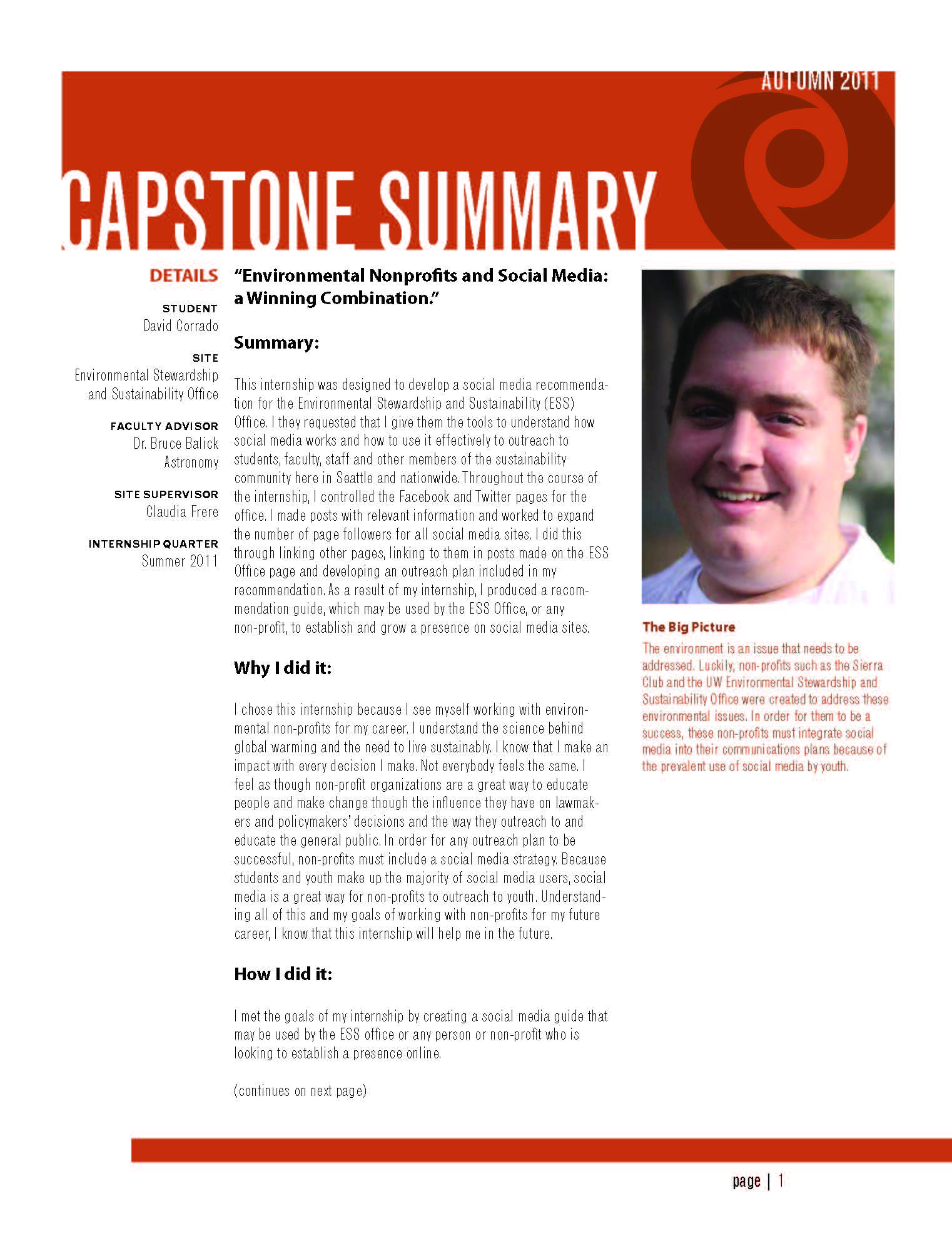 This internship was designed to develop a social media recommendation for the Environmental Stewardship and Sustainability (ESS) Office. I they requested that I give them the tools to understand how social media works and how to use it effectively to outreach to students, faculty, staff and other members of the sustainability community here in Seattle and nationwide. Throughout the course of the internship, I controlled the Facebook and Twitter pages for the office. I made posts with relevant information and worked to expand the number of page followers for all social media sites. I did this through linking other pages, linking to them in posts made on the ESS Office page and developing an outreach plan included in my recommendation. As a result of my internship, I produced a recommendation guide, which may be used by the ESS Office, or any non-profit, to establish and grow a presence on social media sites.