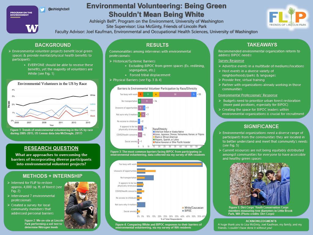 Environmental volunteer projects are extremely beneficial to the health of our local green spaces and the physical and mental health of the participants. However, the majority of environmental volunteers are White, older in age, affluent, and highly educated. The aim of this study was to determine the most common barriers the BIPOC (Black, Indigenous, and other People of Color) community faces that prohibit them from participating in environmental volunteer projects. In order to answer this question, I created a survey which addressed the common barriers citizens experience that make it difficult for them to volunteer. I performed a literature review of ten scholarly sources which analyzed the rationale behind environmental volunteer work. Lastly, I interviewed seven environmental professionals on what they believe may make it more difficult for BIPOC to volunteer. Through this research I found that the most common barriers to participation were: history of excluding BIPOC from outdoor spaces and redlining, not hosting events in a diverse variety of neighborhoods, not enough advertising in various forms about the events (flyers, email, social media, etc.), and not providing free, virtual training on environmental volunteer work. Environmental organizations need to make better efforts to include their BIPOC community members, addressing some of the barriers previously listed would be a strong starting point. Once aware of these barriers, environmental organizations can start to make changes, so that everyone can receive the benefits of environmental volunteering and feel welcomed in green spaces.