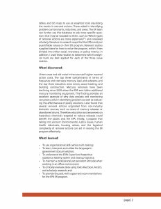 During my project, I assisted Kathy Parker, an EPA On-Scene Coordinator, in collecting documentation for Region 10 removal actions (short-term hazardous material cleanup responses). In the process, I collected and analyzed the logistics of each action which included the site, contaminant, and industry that released it. Looking at the trends in removal actions over the time period of 1996-2013 helped the Emergency Response (ER) team focus on key issues. I further researched and suggested ways that they could quantify the value of the ER program financially as well as through risk reduction.