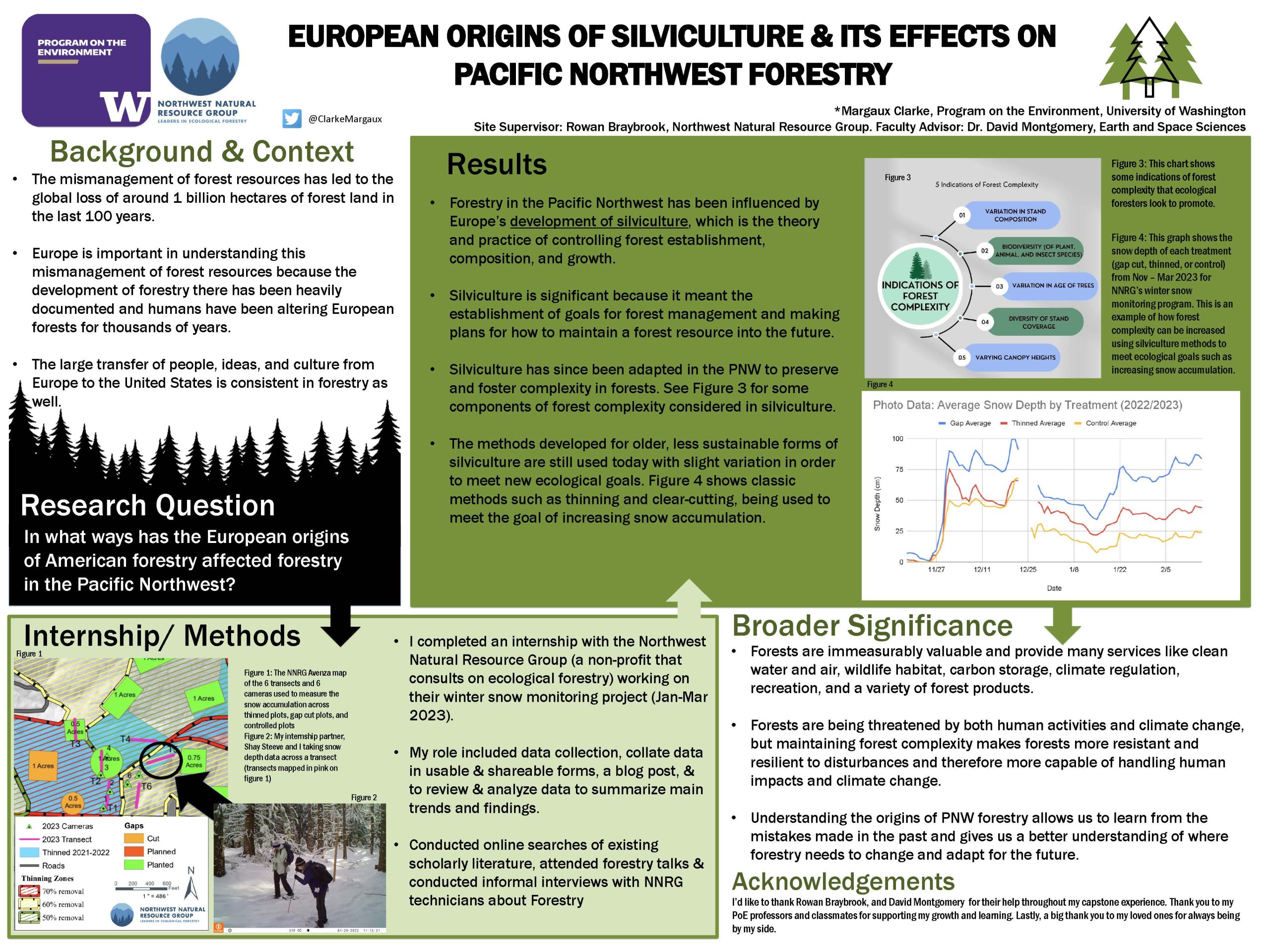 Historically forests across the globe have been degraded due to forestry practices that did not prioritize the health of forests. These practices tended to include operations where there was no attempt to regenerate the forests after use or the methods over-simplified forest structure and composition. Mismanagement like this will ensure quicker degradation of resources and services as well as increase the impacts of climate change. The purpose of this study was to understand how forestry has evolved and changed since these more rudimentary practices and particularly how the forestry in the Pacific Northwest has been shaped by its European origins. To accomplish this task, I interned with the Northwest Natural Resource Group (NNRG) on a project that worked to adapt forests to climate change, as well as I conducted extensive literature review and carried out informal interviews. From my research, there has been a growing trend of shifting forestry objectives towards increasing the health of forests by increasing forest complexity. I was able to see this firsthand in the project I worked on for NNRG which is studying the impact of small patch cuts and thinning in a forest in order to increase snow accumulation (and therefore water supply). These methods, which originate from earlier European silviculture methods, are practiced in such a way that it adds complexity to the forest structure. Continuing this shift towards valuing forest complexity is going to be the key to sustaining and maximizing healthy forests.