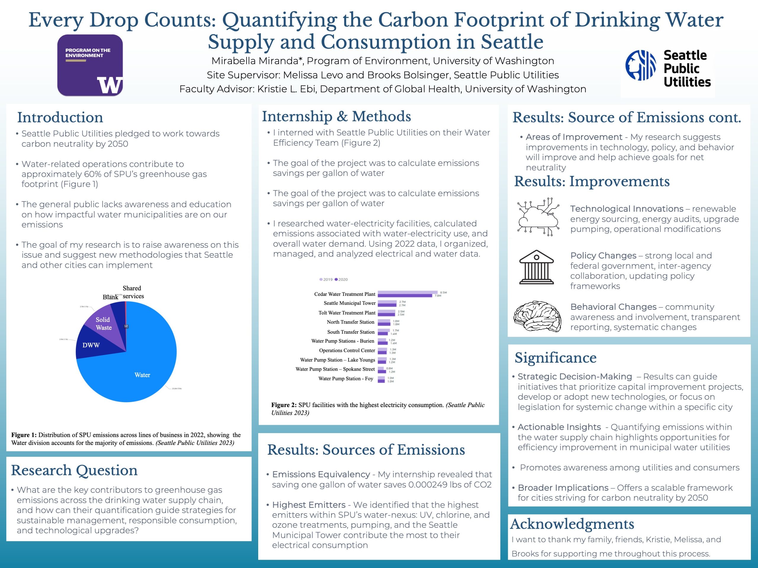 As cities strive to meet climate goals, municipal water systems have emerged as critical yet unexplored contributors to greenhouse gas emissions. Seattle Public Utilities, which provides water to over 1.6 million people, aims for carbon neutrality by 2030. Despite Seattle’s relatively clean grid, water-related operations, particularly electricity use, account for approximately 60% of SPU’s GHG footprint. This study investigates how improving GHG emissions within Seattle’s water system can affect the city’s overall emissions and support its climate goals. Drawing on SPU’s 2022 Greenhouse Gas Emissions Inventory, the analysis identifies electricity and facility fossil fuels as a major emission sources within the water system. This paper synthesizes national frameworks, such as the U.S. Environmental Protection Agency guide to energy efficiency in water utilities, the global best practices from Amirrahmani (2024), which emphasizes the importance of governance, stakeholder engagement, and policy integration. Additionally, as part of my internship with SPU’s Water Efficiency team, I conducted research on water-electricity facilities, calculated emissions associated with water use, and estimated savings per gallon conserved. The water line of business contributes 60% of SPU’s overall emissions, and roughly 60% of this can be optimized through efficiency improvements in treatment processes, pumping, and building operations. The broader implications of this research suggest that Seattle’s leadership in water system decarbonization could serve as a replicable model for other municipalities. By aligning technical innovation with policy reform and community engagement, Seattle has the potential to redefine sustainable urban infrastructure and contribute meaningfully to global climate resilience.