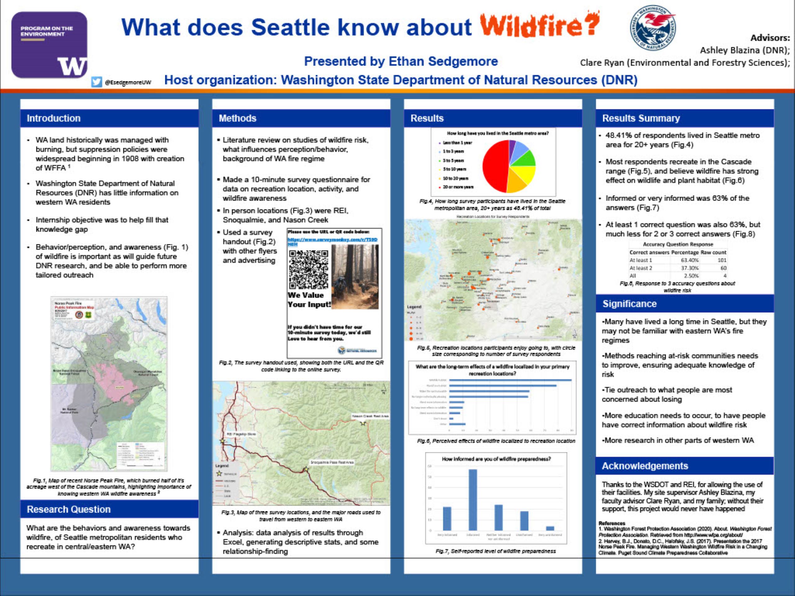 The Washington Department of Natural Resources (DNR) does not have baseline data of behaviors, perceptions, or awareness of western Washington (WA) residents regarding wildfire. To effectively perform outreach, circulate educational materials, and conduct research, this knowledge gap must be filled. This study’s purpose was to choose a pilot area to develop some of this baseline data. For this project, our team created and administered a survey to Seattle metropolitan residents who frequently recreate in central or eastern WA, choosing that population because people within frequently move between different fire regimes, and they may bring awareness, perceptions, and behaviors of eastern WA over to western WA. Alongside the survey, I conducted a literature review of similar studies. Survey results show that most respondents (63.2%) indicated they were informed or very informed of wildfire risks; however fewer respondents (46.91%) correctly answered the wildfire knowledge questions. This discrepancy indicates the WADNR must focus more on wildfire-risk education. Being more aware and active in recreation can give people the chance to help prevent fires. Additionally, about half of respondents (54.7%) have experienced wildfire, and most respondents feel that a wildfire within a few miles (89.2%) or within a mile (87.9%) of their recreation site would adversely affect their recreation ability. This study only identified baseline information, so more focused analysis is needed for specific community behaviors and perceptions of wildfire. Finally, this study only considered the Seattle metropolitan area, so other studies in western WA, especially within the Wildland-Urban Interface (WUI), should be conducted.