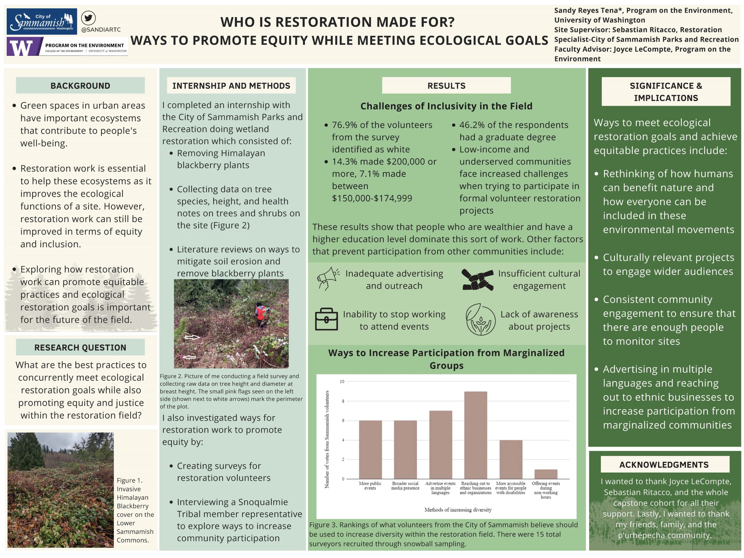 Rapid urbanization is causing the health of ecosystems to deteriorate, and with the human population expected to grow in the coming years, solutions to this environmental deterioration are required. Doing restoration work is often seen as a benevolent act used to restore ecosystems that have been and continue to be degraded, especially due to anthropogenic factors such as deforestation and land-use change. While this work is necessary, it is essential to remain critical of its pitfalls and the ways in which restoration work can be improved upon. This project aims to find ways to improve restoration work and integrate more equitable practices, such as including more people of color. Through online surveys given to park stewards, a restoration plan and proposal, and hands-on restoration work with the City of Sammamish Parks and Recreation, the project will add to the body of knowledge surrounding restoration and make it more inclusive. With that information, I found that volunteers believe the best way to improve equity in the restoration field would be to reach out to ethnic-owned businesses and advertise events in multiple languages. Doing this will also aid in the process of including environmental justice in restoration work, allowing the City of Sammamish Parks and Recreation to gain more support for its restoration work and encourage community participation in its efforts.