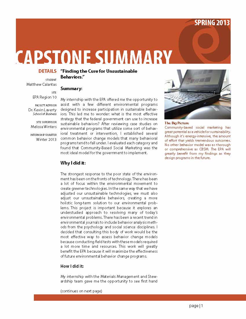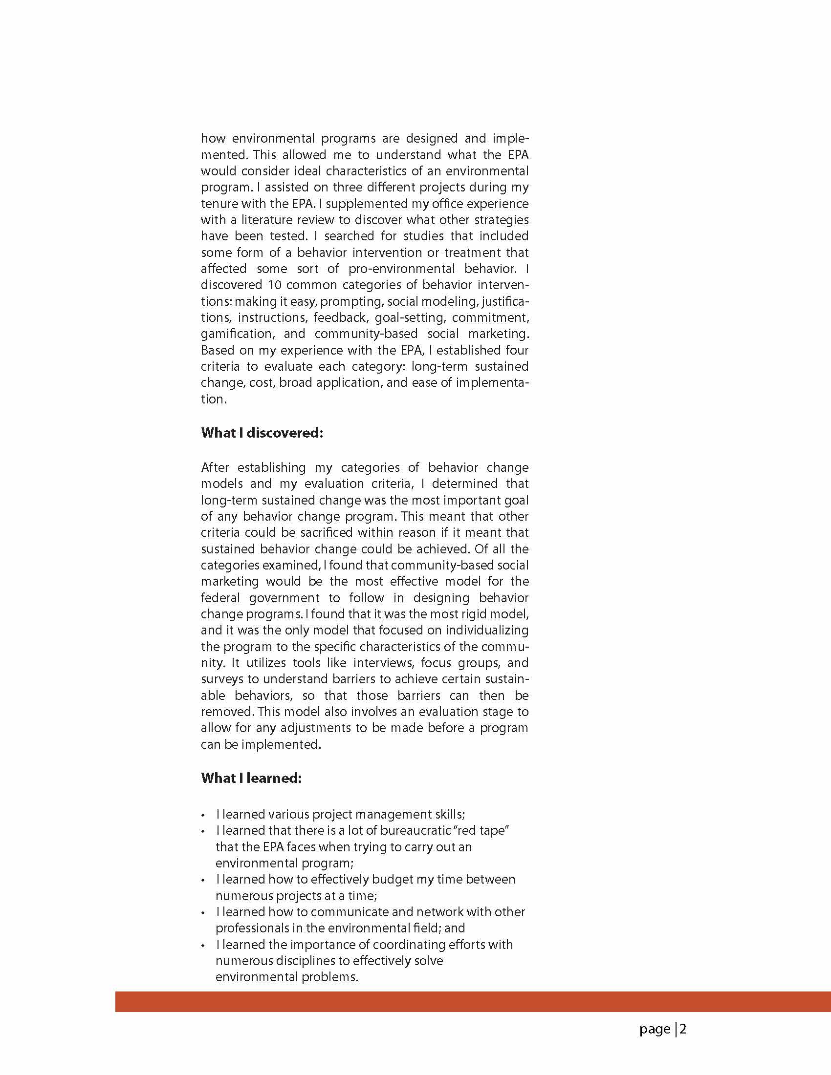 My internship with the EPA offered me the opportunity to assist with a few different environmental programs designed to increase participation in sustainable behaviors. This led me to wonder: what is the most effective strategy that the federal government can use to increase sustainable behaviors? After reviewing case studies on environmental programs that utilize some sort of behavioral treatment or intervention, I established several common behavior change models that many behavioral programs tend to fall under. I evaluated each category and found that Community-Based Social Marketing was the most ideal model for the government to implement.