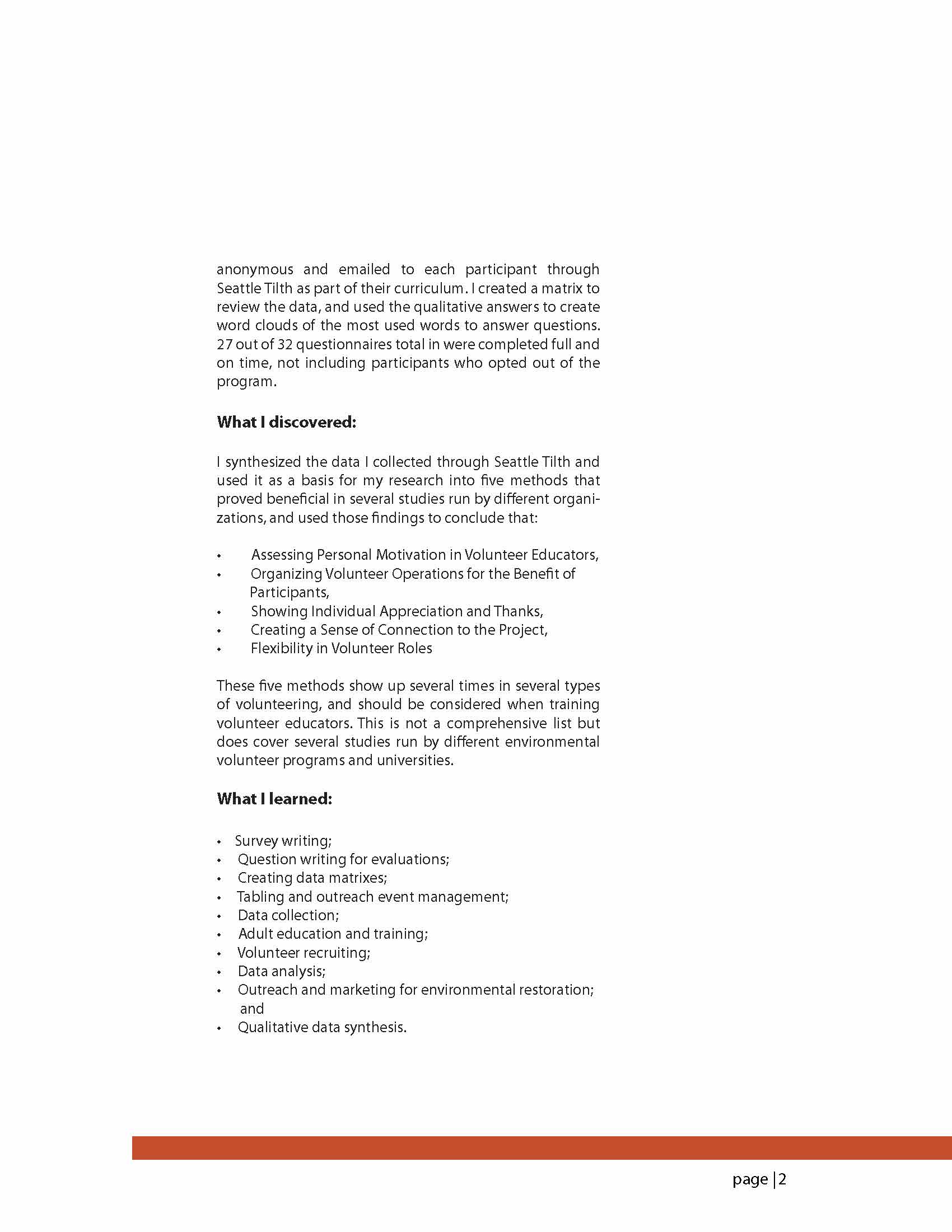 Studying volunteer motivation in volunteer educators, those that choose to take on extra training and responsibility in volunteer projects, is important to both non-profits and environmental organizations. By running a case study through Seattle Tilth, I was able to understand why some volunteers choose these roles, and I was able to collect survey data from each participating member on their motivation, goals and thoughts on the training they are undertaking to become volunteer educators. I used the survey results as the basis for my research into some methods organizations can use if they are going to train and motivate volunteer educators in the future.