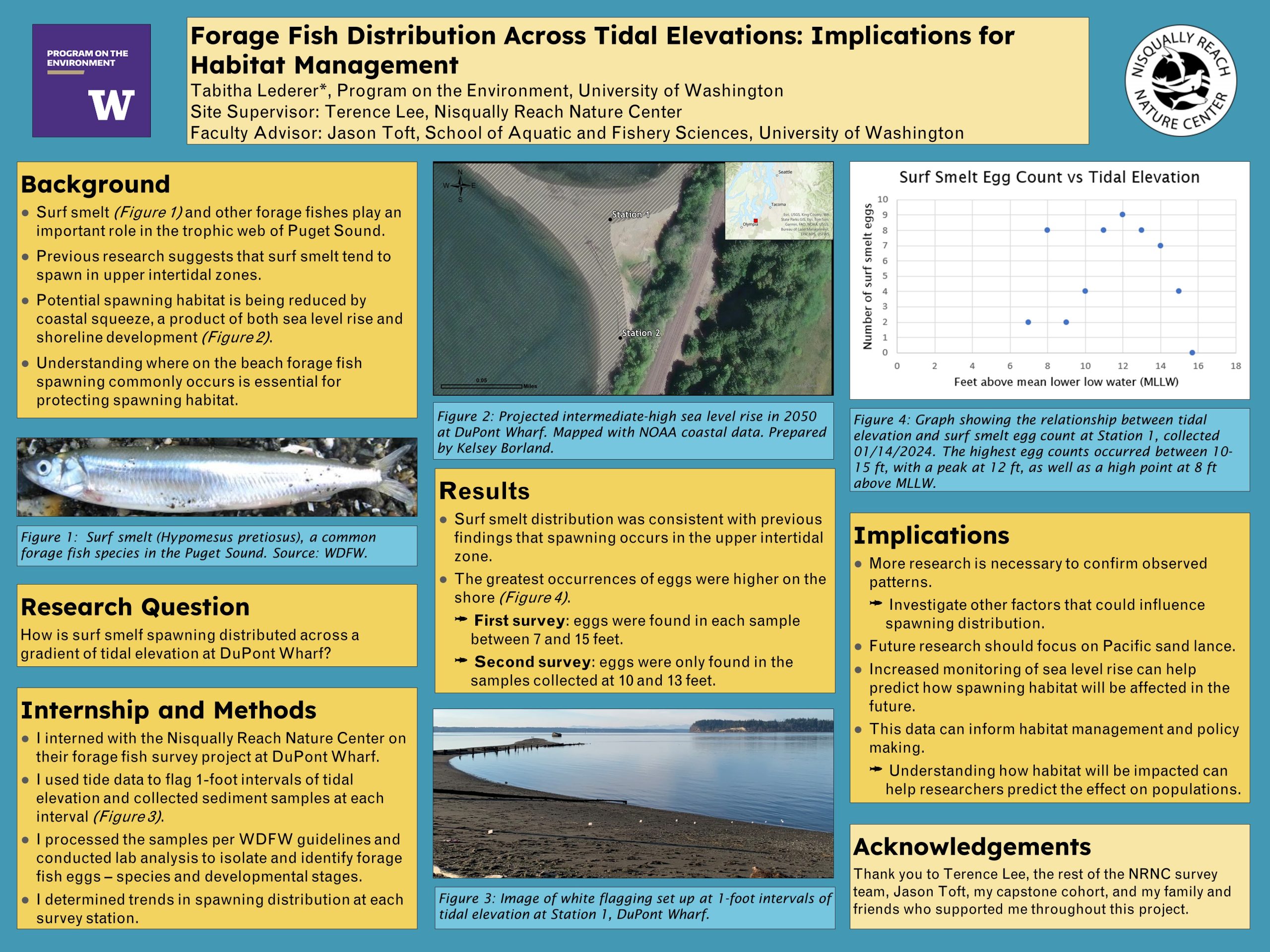 Forage fish play an essential role in the trophic flow of marine ecosystems, as a food source for culturally and ecologically important species, such as salmon and marine mammals. Their role makes forage fish species, like surf smelt and Pacific sand lance, indicator species for the ecosystem health of Puget Sound. However, as sea level rise and shoreline development increase, the shoreline habitats that forage fish need for spawning are being reduced. My research aimed to determine how tidal elevation influences forage fish spawning distribution at DuPont Wharf, Washington. I worked with the Nisqually Reach Nature Center to collect sediment samples and analyze them to find forage fish eggs and map their distribution patterns along the shoreline. The findings indicate that surf smelt distribution is concentrated at higher tidal elevations, with a peak at 12 feet above mean lower low water; the results on sand lance distribution were inconclusive. More research is required to support these conclusions and find more influences on spawning distribution. Distribution data can be used to inform habitat management and influence decision-making about shoreline development and conservation in Puget Sound.