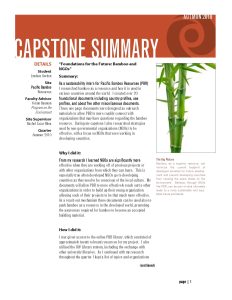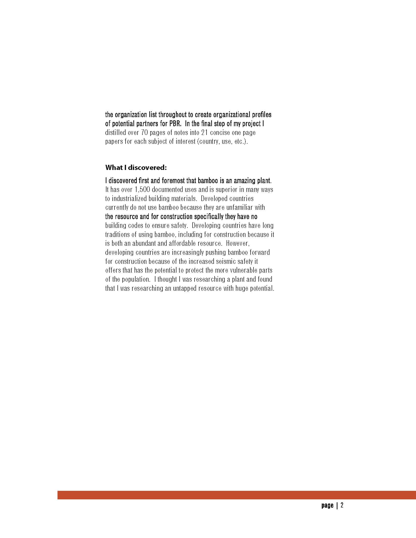 These one page documents were designed as outreach materials to allow PBR to more readily connect with organizations that may have questions regarding the bamboo resource. During my capstone I also researched strategies used by non-governmental organizations (NGOs) to be effective, with a focus on NGOs that were working in developing countries.