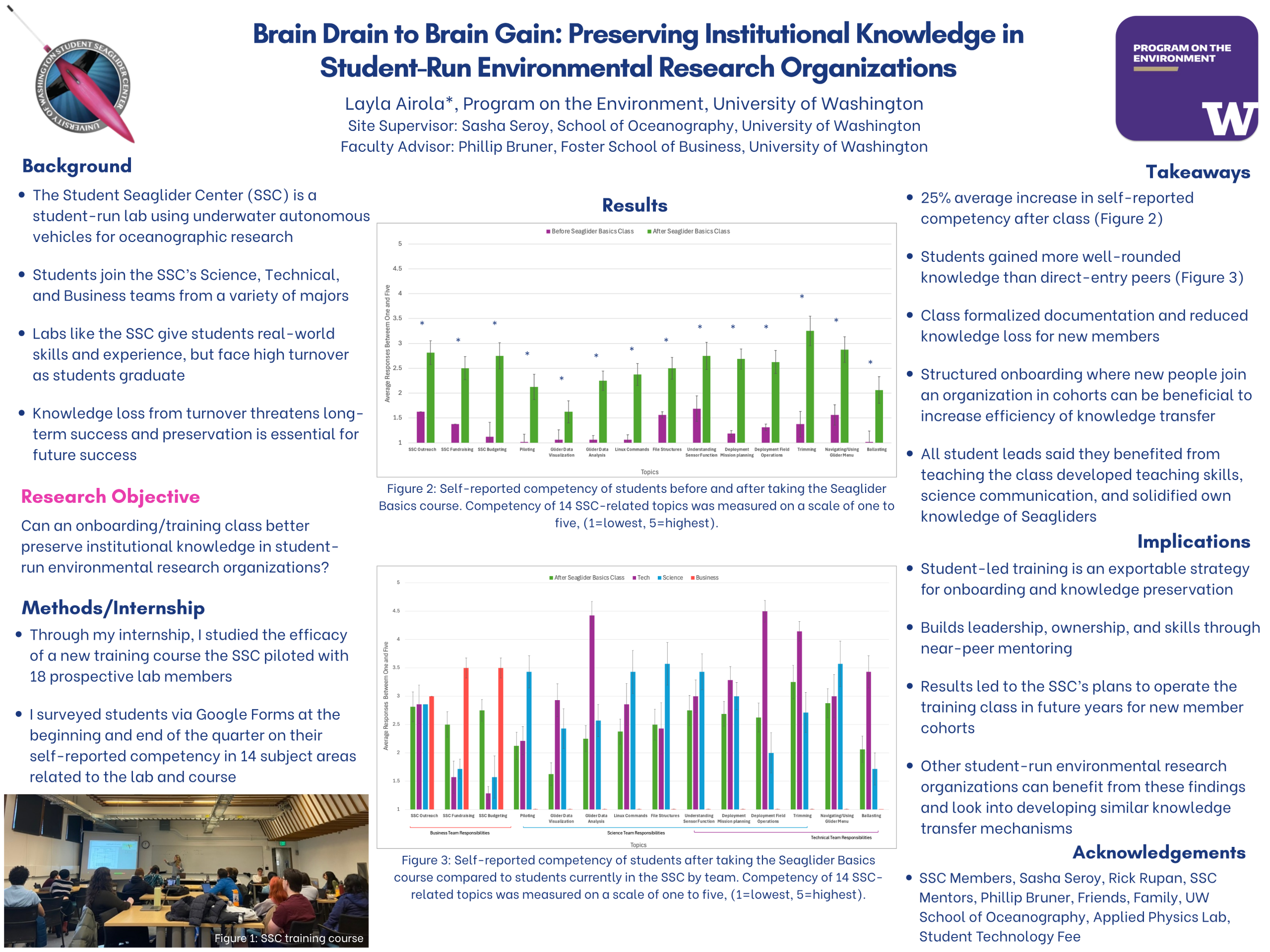 Student-run environmental research organizations allow students to gain real-world experience while conducting research that leads to a greater understanding of the environment. These programs suffer from high turnover when students graduate and take the knowledge they have acquired with them. Loss of institutional knowledge is a major issue for organizations that rely on students and mitigating this loss is essential to ensure the success and longevity of a program. This project aims to find how student-run environmental research organizations can better preserve institutional knowledge through a case study with the Student Seaglider Center: a student-run lab at the University of Washington’s School of Oceanography. For my capstone, I interned at the SSC and studied the efficacy of a new training class for students interested in joining the lab. I tracked how self-reported competency in various subject areas important to the lab like piloting, ballasting, and data analysis changed throughout the quarter. I found that from the beginning to end of the quarter, students reported an average increase of 24.89% in self-reported competency and 6.55% higher overall competency than students who were in the lab for one quarter but did not take the class. These results indicate that a course is an effective method to transfer knowledge from experienced members to newer ones which will help the SSC and other student-run research programs operate efficiently in the future and continue to do impactful environmental research.