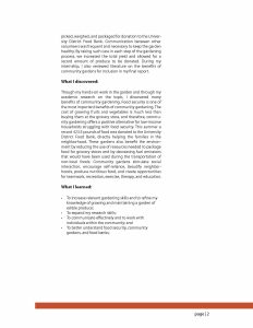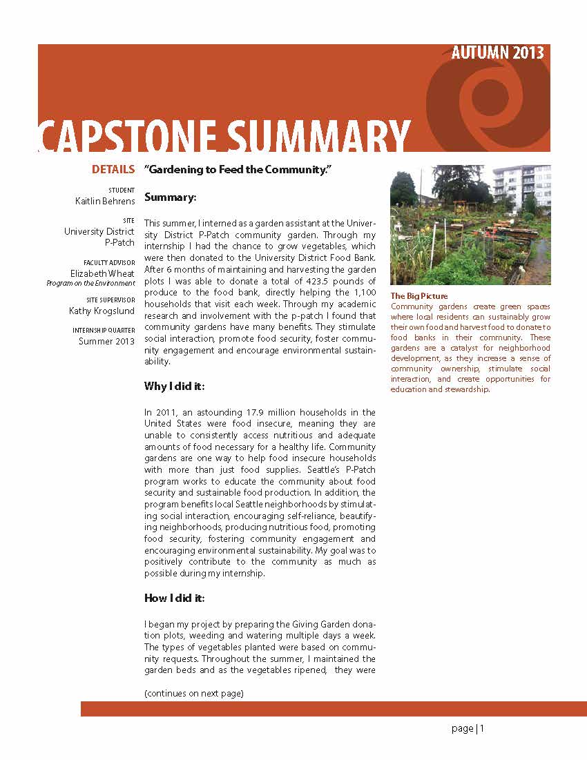 This summer, I interned as a garden assistant at the Univer- sity District P-Patch community garden. Through my internship I had the chance to grow vegetables, which were then donated to the University District Food Bank. After 6 months of maintaining and harvesting the garden plots I was able to donate a total of 423.5 pounds of produce to the food bank, directly helping the 1,100 households that visit each week. Through my academic research and involvement with the p-patch I found that community gardens have many benefits. They stimulate social interaction, promote food security, foster community engagement and encourage environmental sustainability.