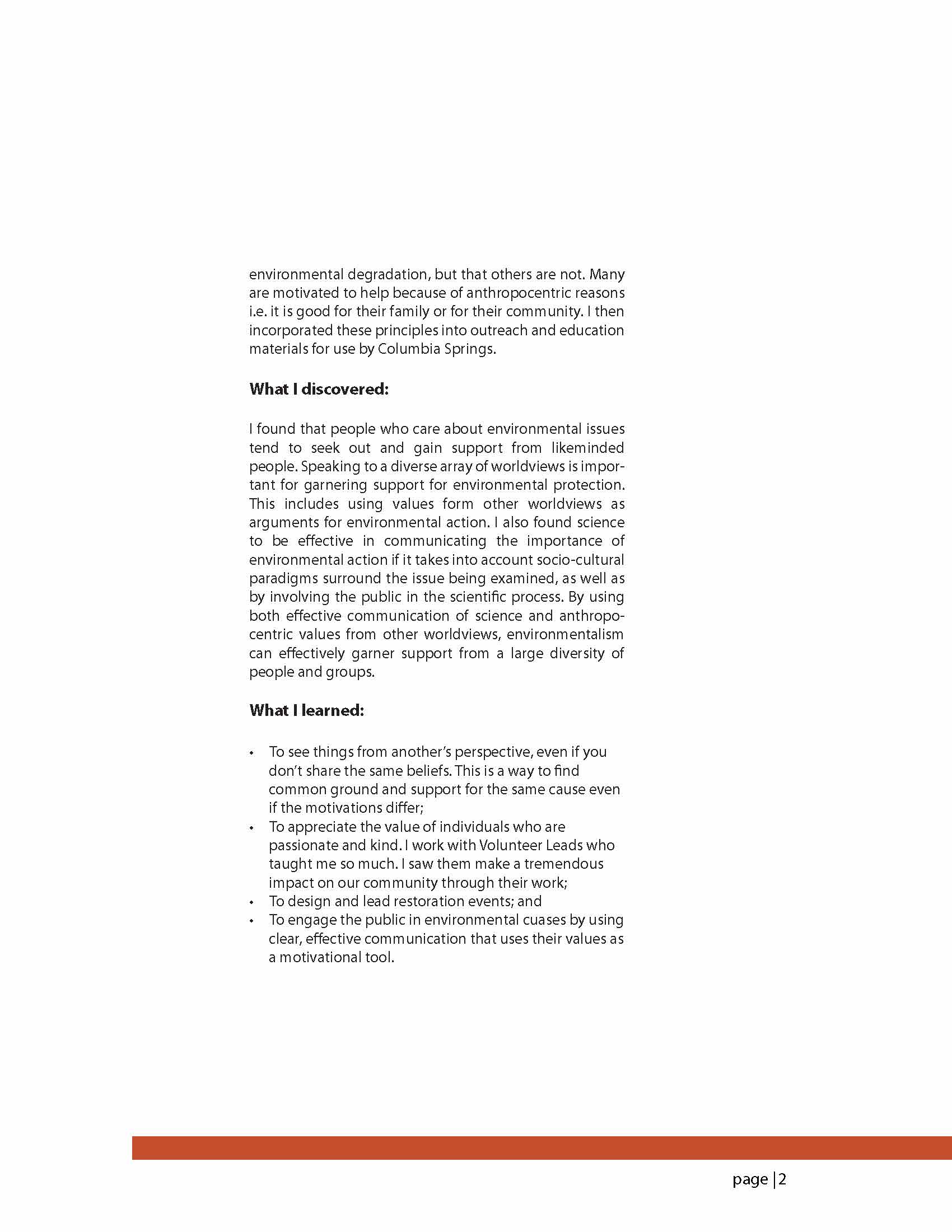 I started my internship as the Restoration Intern at Columbia Springs Environmental Education Center in June 2012 and spent that summer leading community volunteer events and conducting outreach efforts. During this time I spoke with members of the public about what motivated them to help out. I wanted to understand what motivates people to engage in environmental restoration so that I could help Columbia Springs recruit more volunteers, donations, and support from the community to increase the scope of their valuable work.