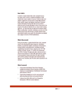 For my capstone project, I worked to compile databases of the locations of freight-related facilities in the metropolitan areas of Seattle-Tacoma, Boise, Anchorage, and Portland. This project was formed as a component of the Environmental Protection Agency’s (EPA) response to recommendations of the National Environmental Justice Advisory Council on working towards environmental justice with regard to diesel emissions impacts. My internship also included a number of other projects: creating a report of progress and methods, creating a report of recommendations for outreach to schools, and delivering a live/webinar presentation at the EPA.
